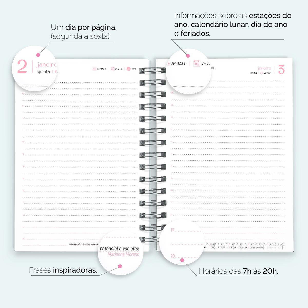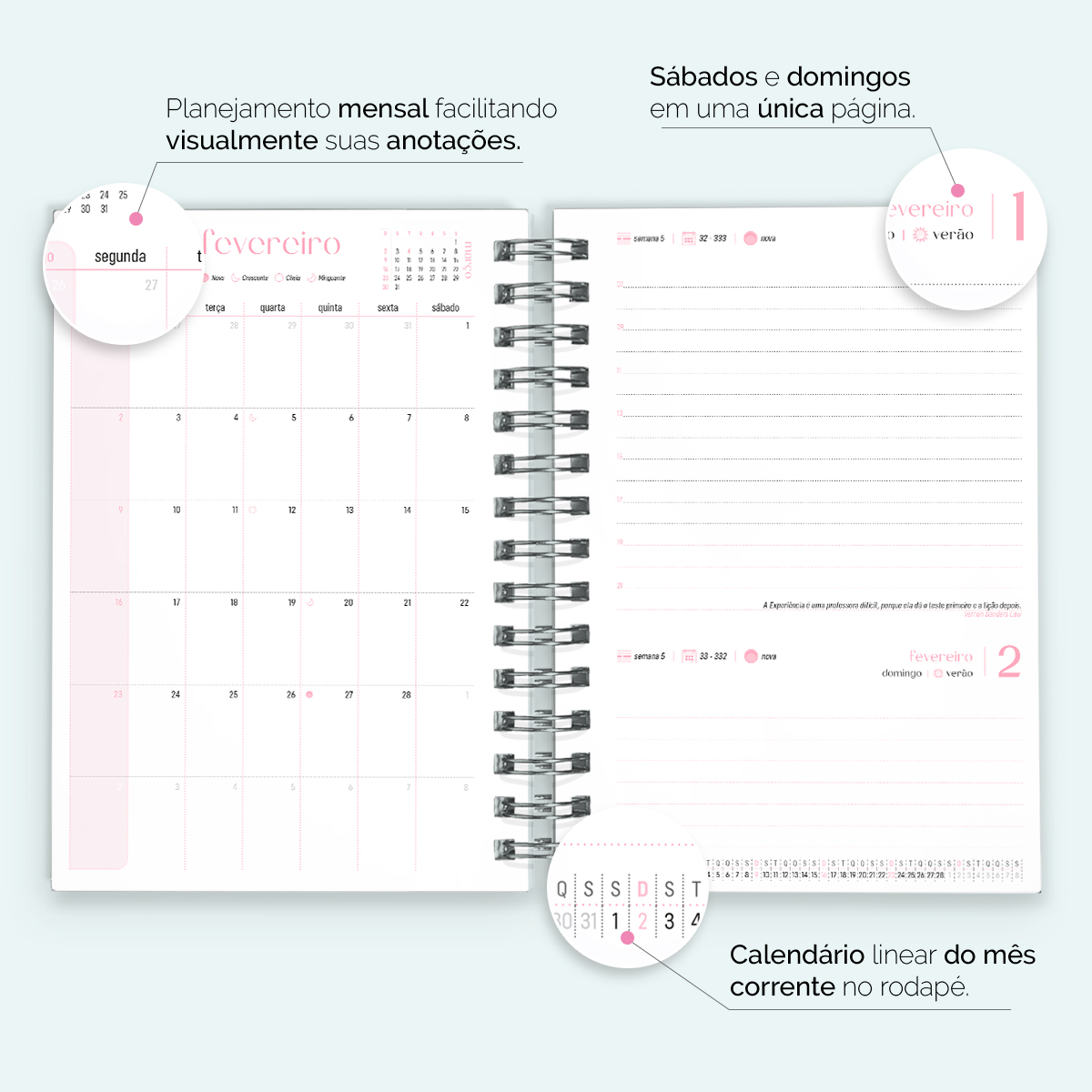 A cada mês, você pode contar com uma página de planejamento mensal, facilitando a visualização de suas principais anotações. Além disso, cada página possui indicações de feriados, estações do ano, calendário lunar, número da semana, frases inspiradoras e um calendário linear do mês no rodapé.