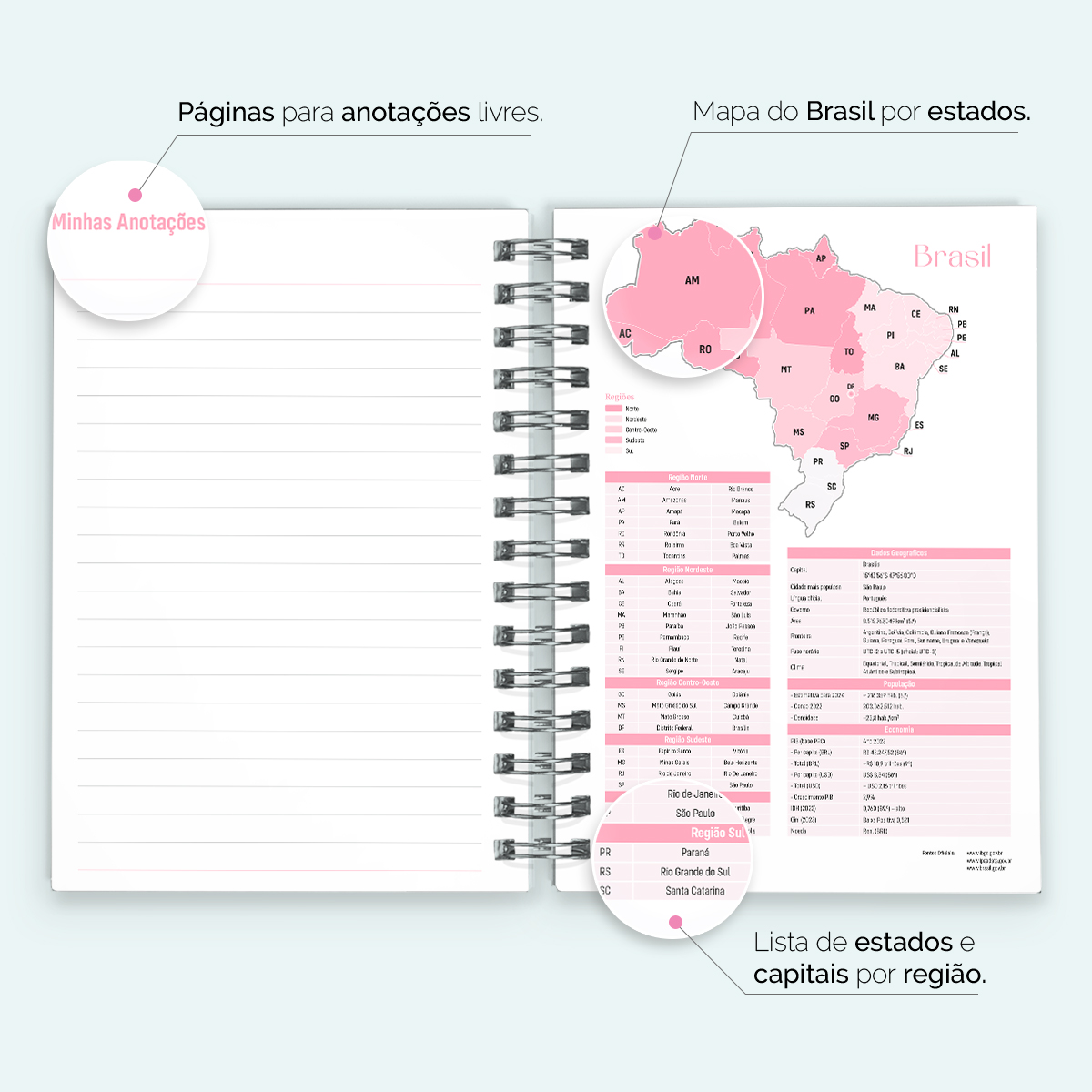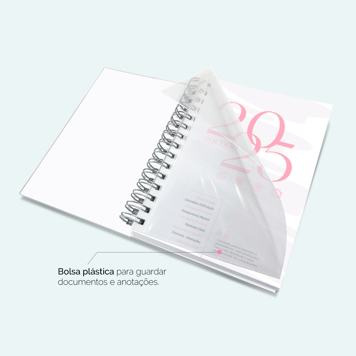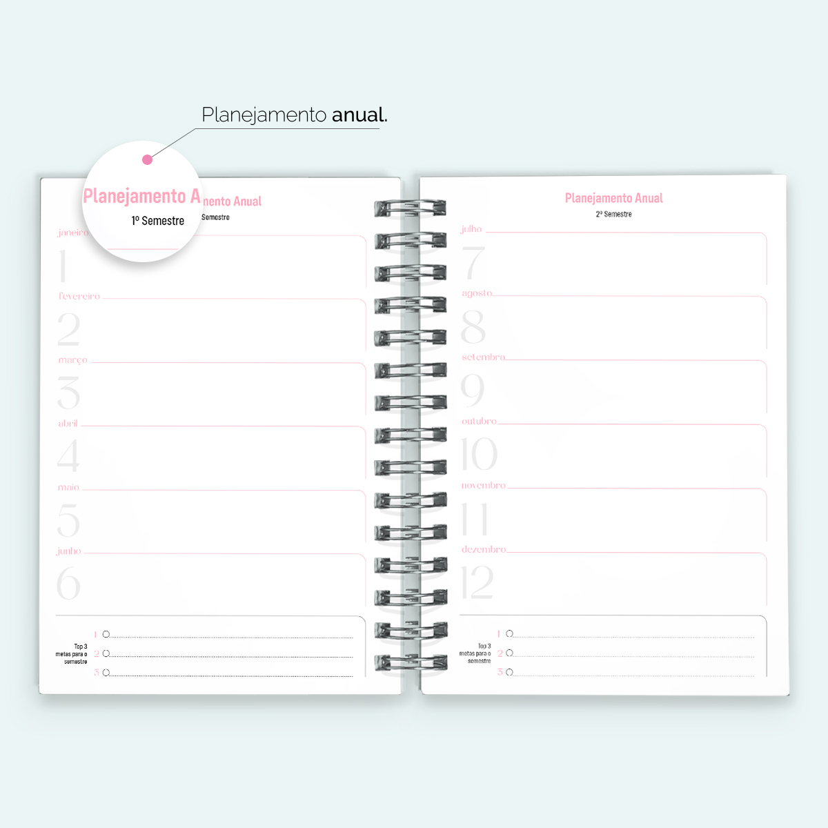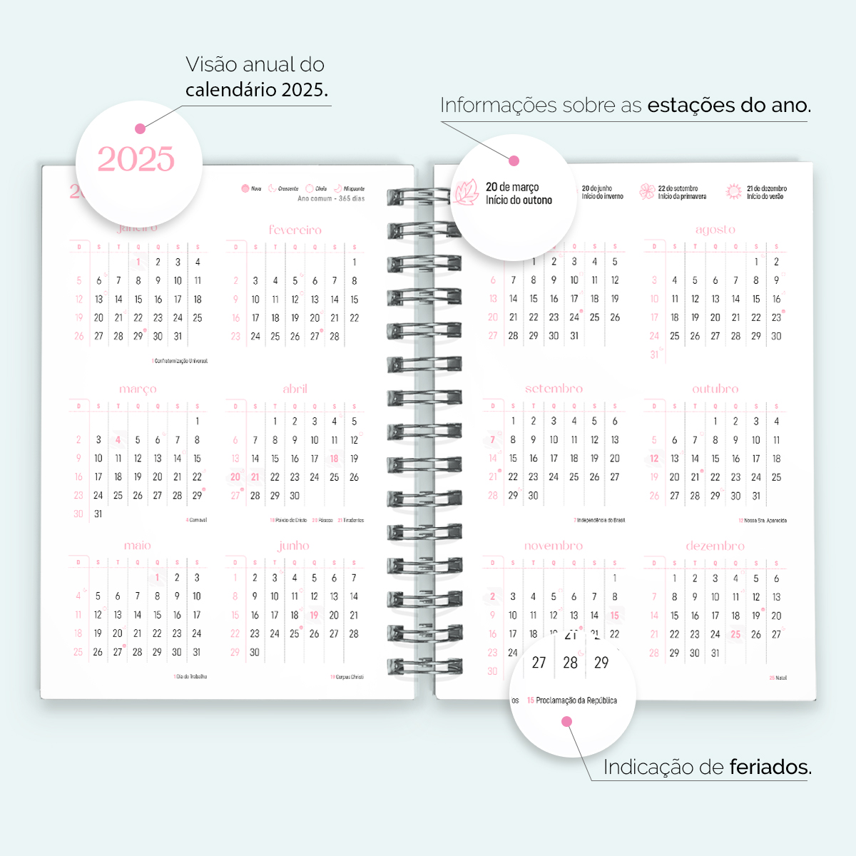 A cada mês, você pode contar com uma página de planejamento mensal, facilitando a visualização de suas principais anotações. Além disso, cada página possui indicações de feriados, estações do ano, calendário lunar, número da semana, frases inspiradoras e um calendário linear do mês no rodapé.