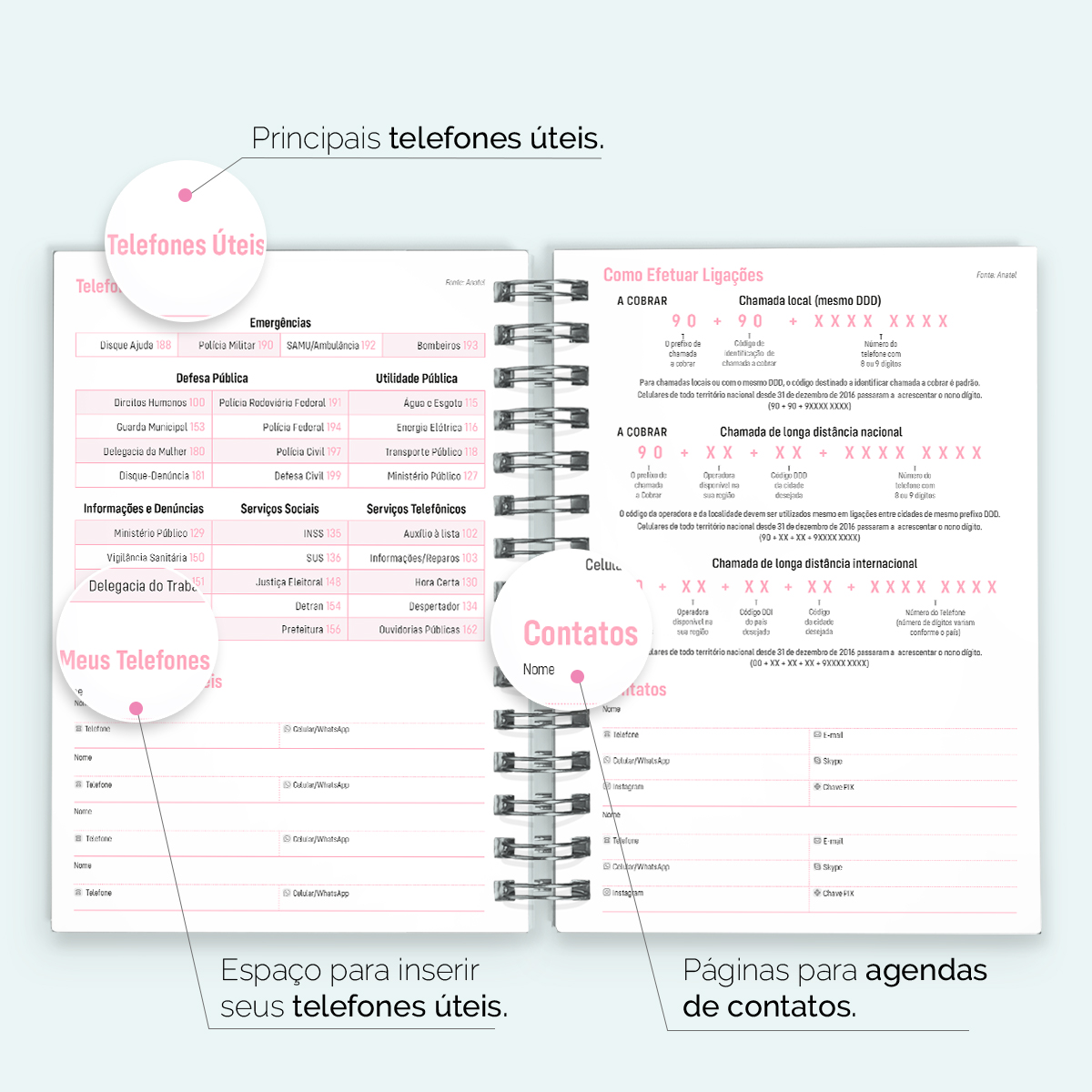 Ao final da agenda, há uma página com os principais números de telefone úteis, além de instruções sobre como efetuar ligações, uma seção dedicada a contatos, uma página em formato “bullet list” para itens de lista, páginas para anotações livres e um mapa do Brasil.