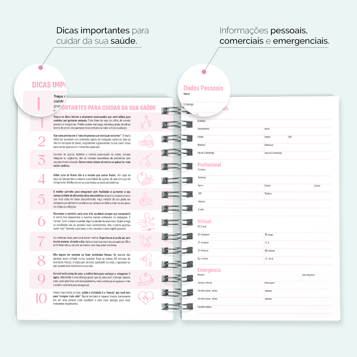 Logo no início, você pode preencher todos os seus dados pessoais, comerciais e emergenciais, seguido pela “Minha Página ON”, ideal para registrar suas contas digitais, com seus respectivos logins e senhas, e uma página de “Datas Importantes/Aniversários”, com os 12 meses do ano organizados para você anotar aniversários e datas a serem lembradas.
