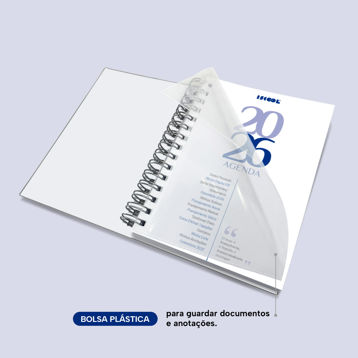 Bolsa plástica para guardar documentos e anotações.