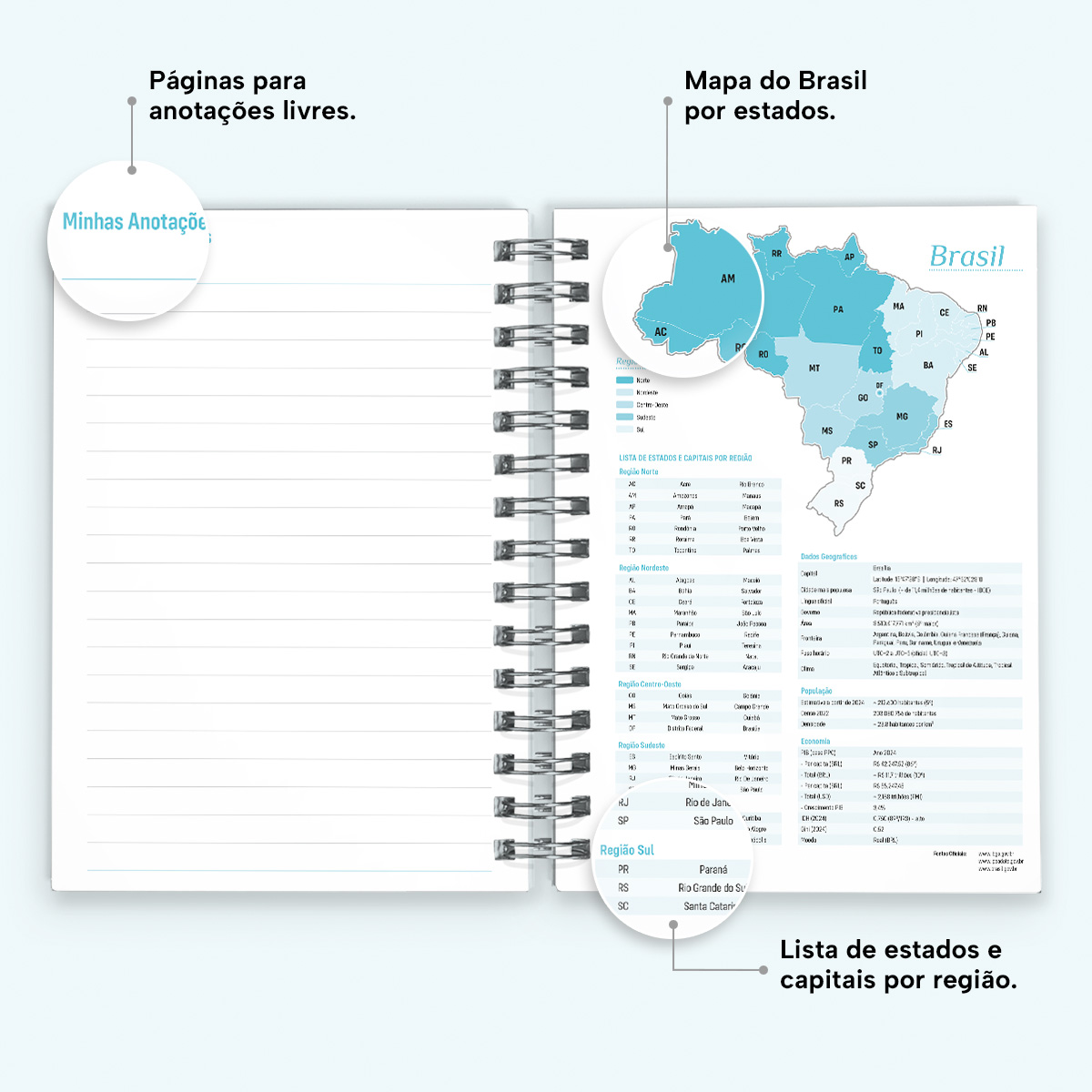 Ao final da agenda, há uma página com os principais números de telefone úteis, além de instruções sobre como efetuar ligações, uma seção dedicada a contatos, uma página em formato “bullet list” para itens de lista, páginas para anotações livres e um mapa do Brasil.