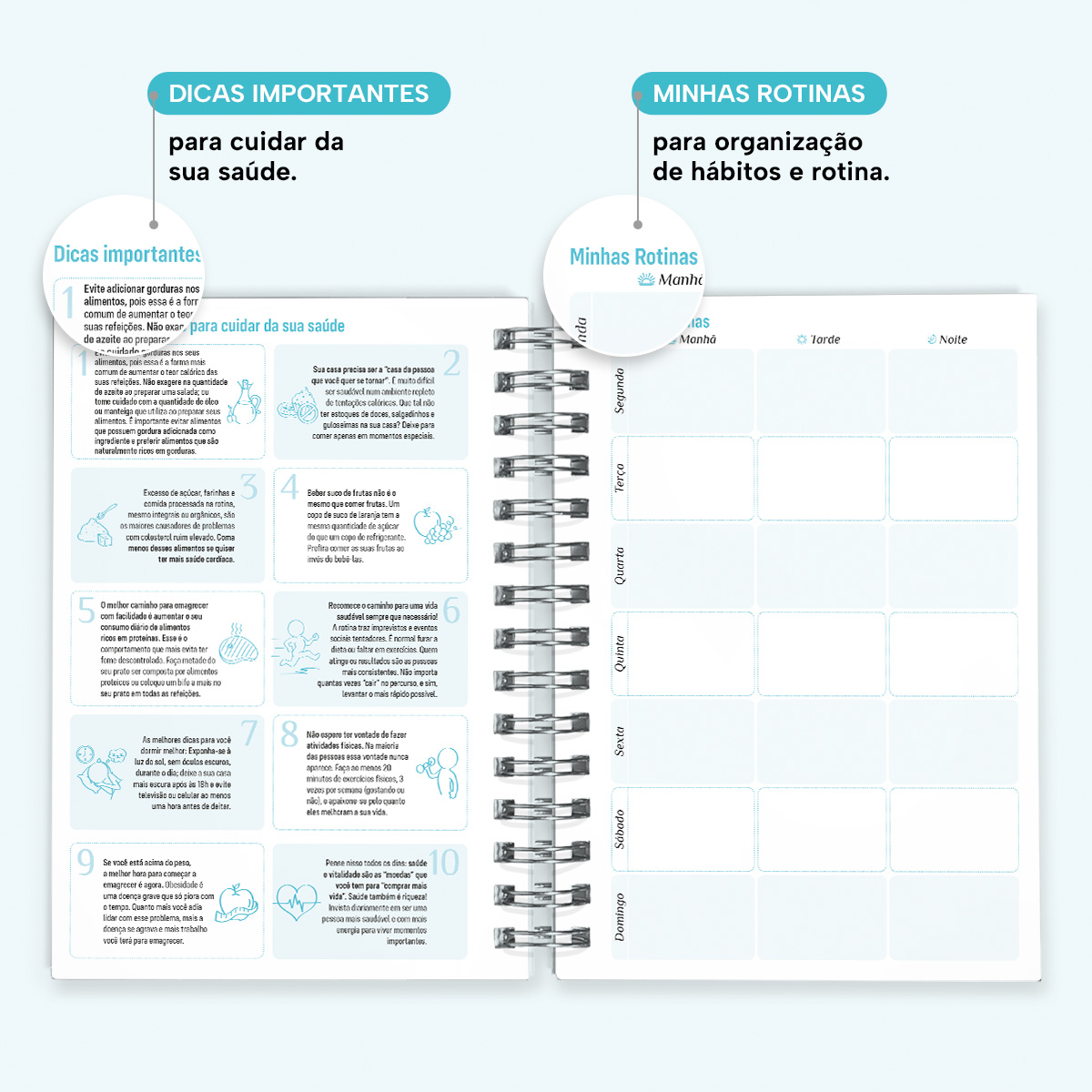 A cada mês, você pode contar com uma página de planejamento mensal, facilitando a visualização de suas principais anotações. Além disso, cada página possui indicações de feriados, estações do ano, calendário lunar, número da semana, frases inspiradoras e um calendário linear do mês no rodapé.
