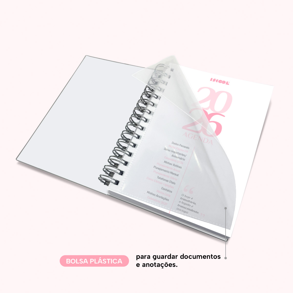 Bolsa plástica para guardar documentos e anotações.