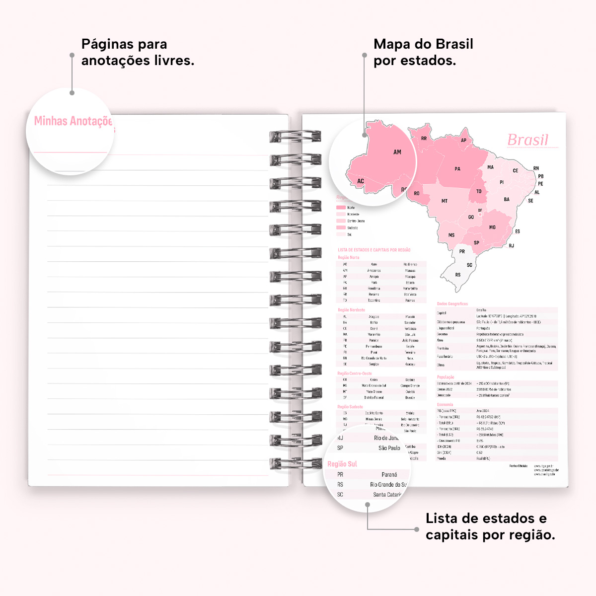 Ao final da agenda, há uma página com os principais números de telefone úteis, além de instruções sobre como efetuar ligações, uma seção dedicada a contatos, uma página em formato “bullet list” para itens de lista, páginas para anotações livres e um mapa do Brasil.