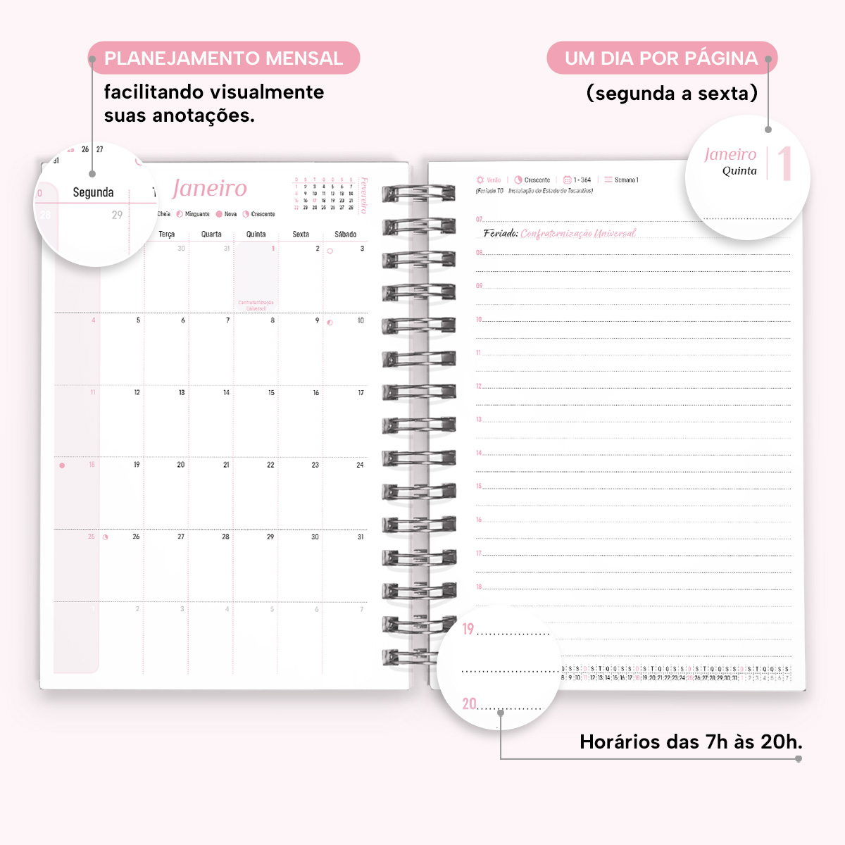 A cada mês, você pode contar com uma página de planejamento mensal, facilitando a visualização de suas principais anotações. Além disso, cada página possui indicações de feriados, estações do ano, calendário lunar, número da semana, frases inspiradoras e um calendário linear do mês no rodapé.