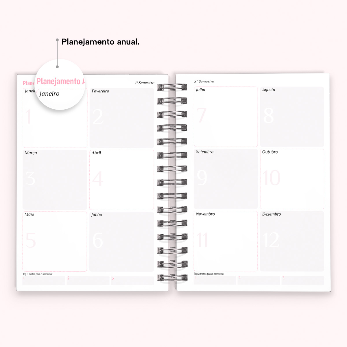 Em seguida, há uma visão geral do calendário completo de 2026, seguido de um planejamento anual para registrar seus objetivos e metas para cada semestre.