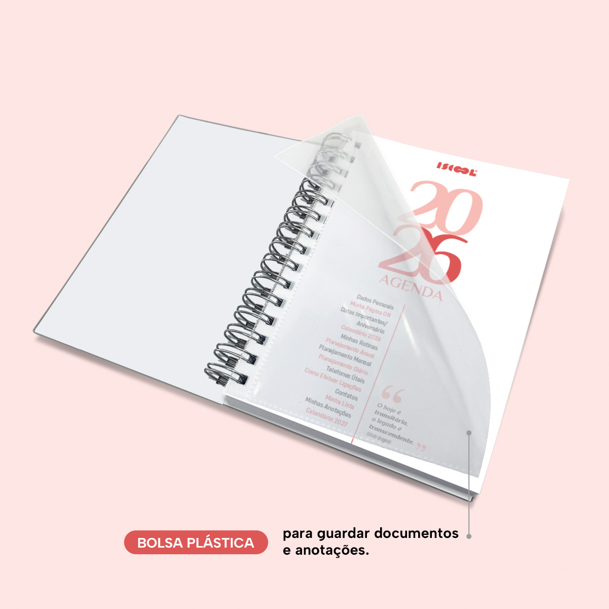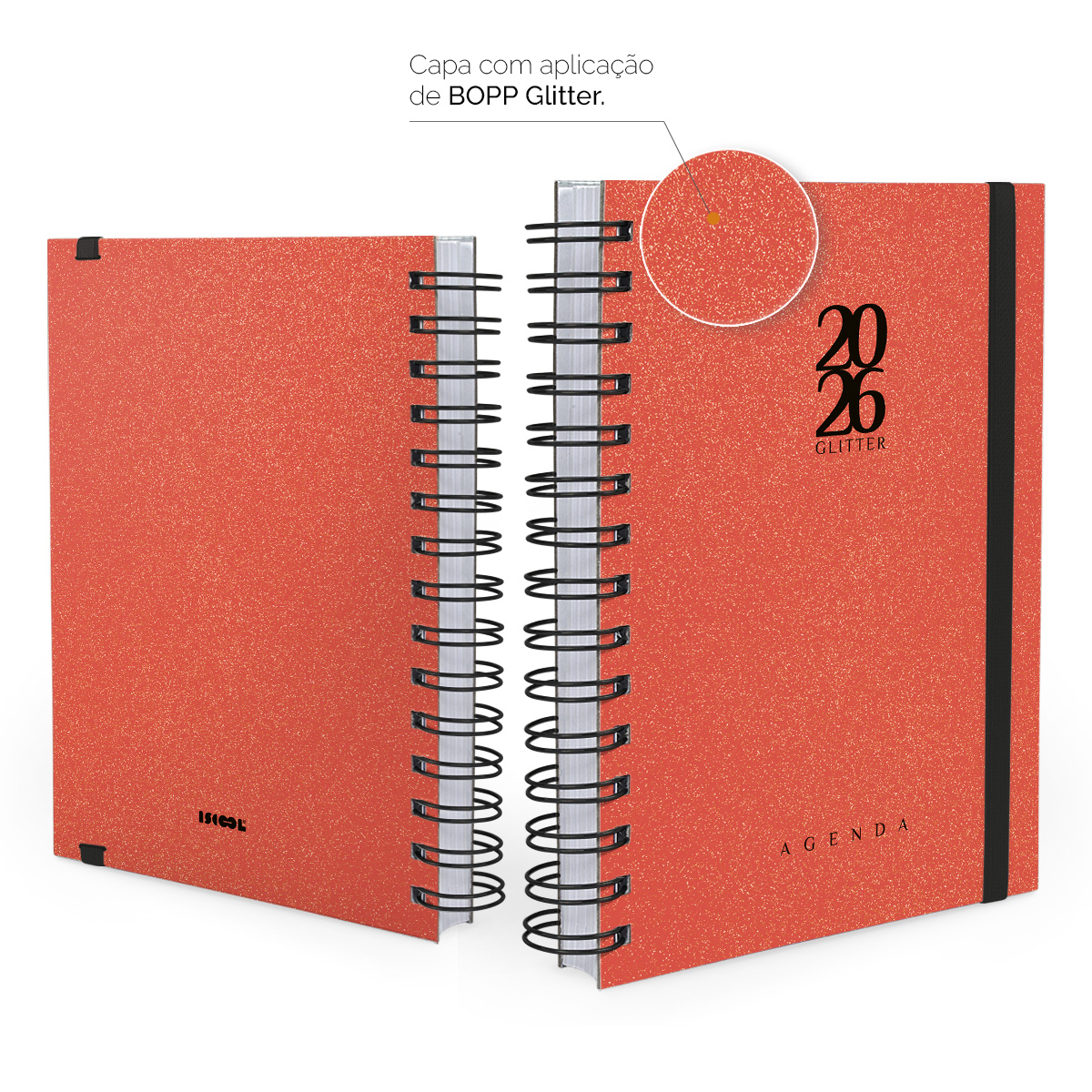 Nossa agenda possui um acabamento especial com BOPP glitter que proporciona o efeito de brilho glitter que se destaca sob luz intensa, e o melhor de tudo é que o glitter não solta!