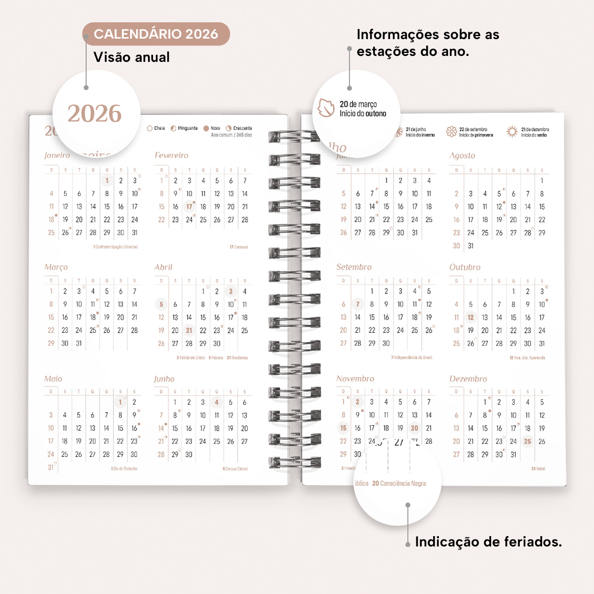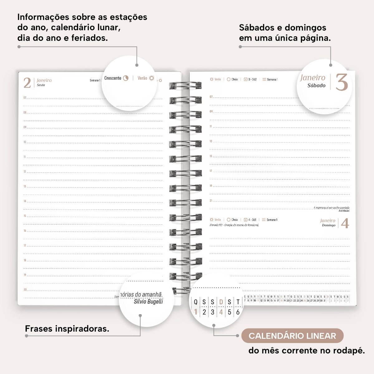 A cada mês, você pode contar com uma página de planejamento mensal, facilitando a visualização de suas principais anotações. Além disso, cada página possui indicações de feriados, estações do ano, calendário lunar, número da semana, frases inspiradoras e um calendário linear do mês no rodapé.