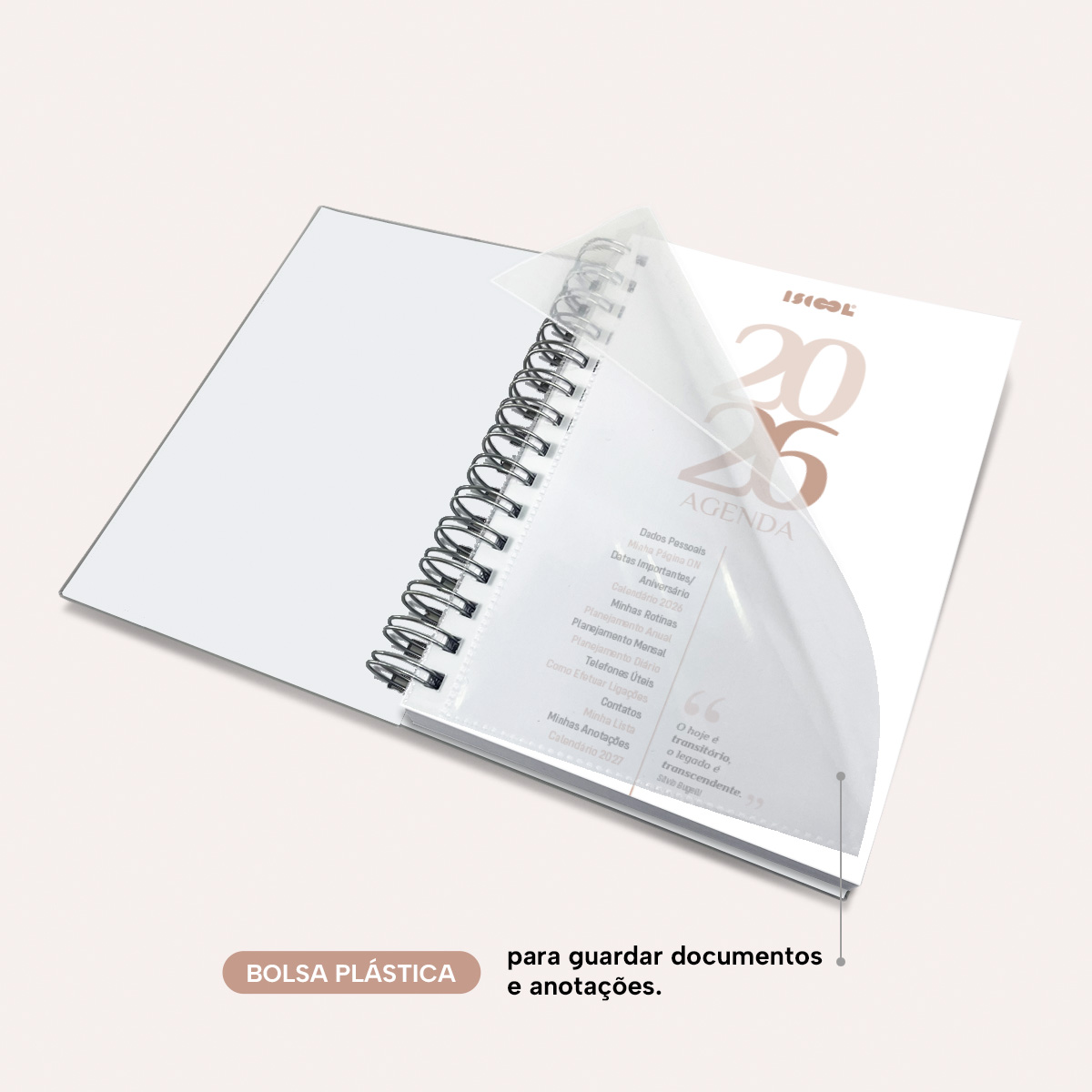 Bolsa plástica para guardar documentos e anotações.