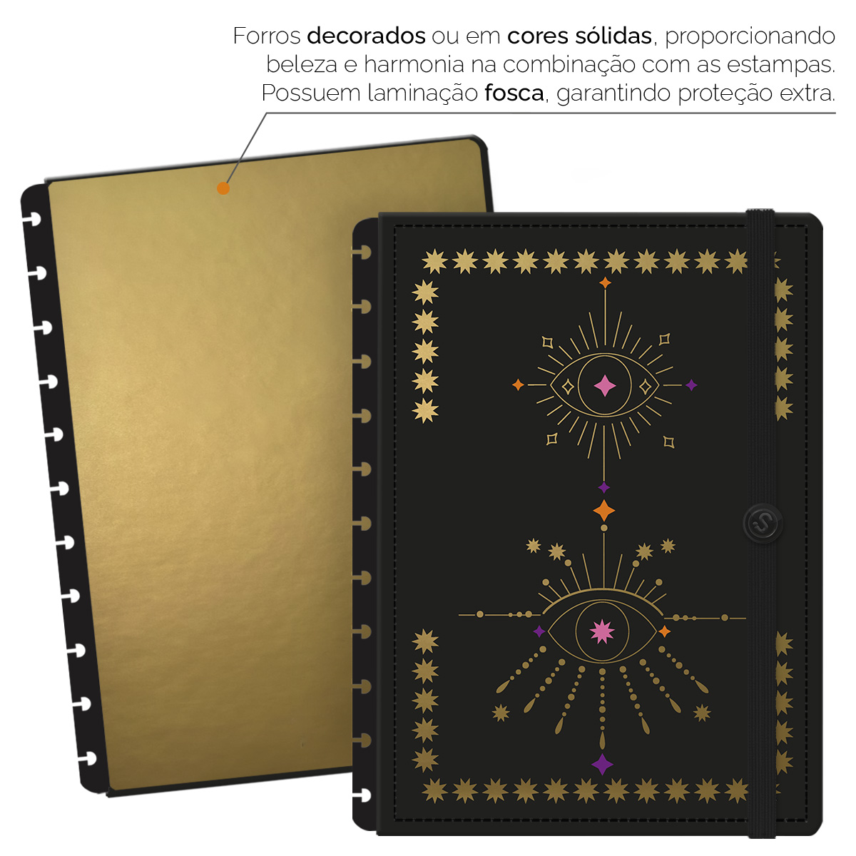 - Forros decorados ou em cores sólidas, com laminação fosca, garantem proteção extra.