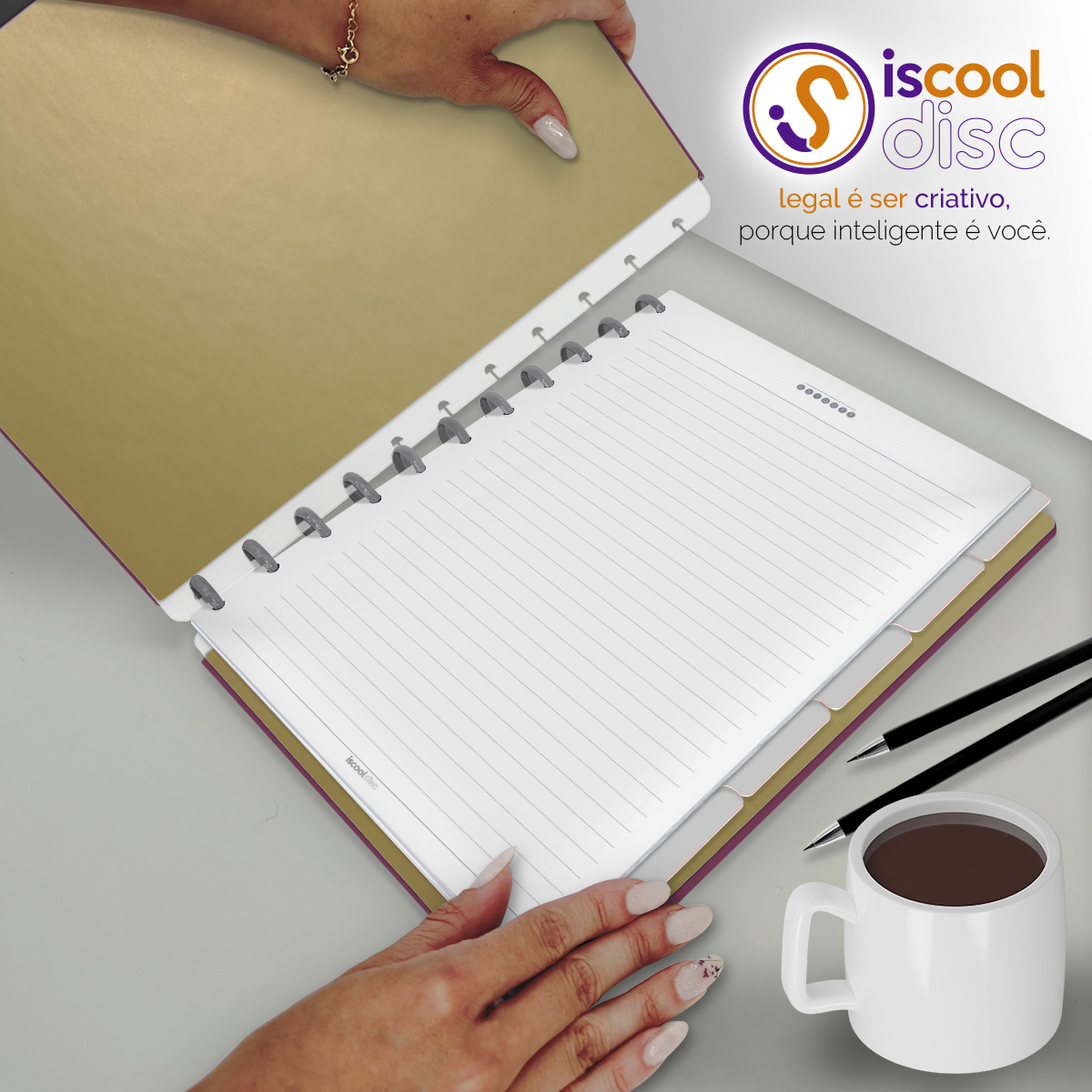 Com furos no formato de "cogumelo", é compatível com outros fabricantes de cadernos de disco, inclusive da marca Caderno Inteligente®.