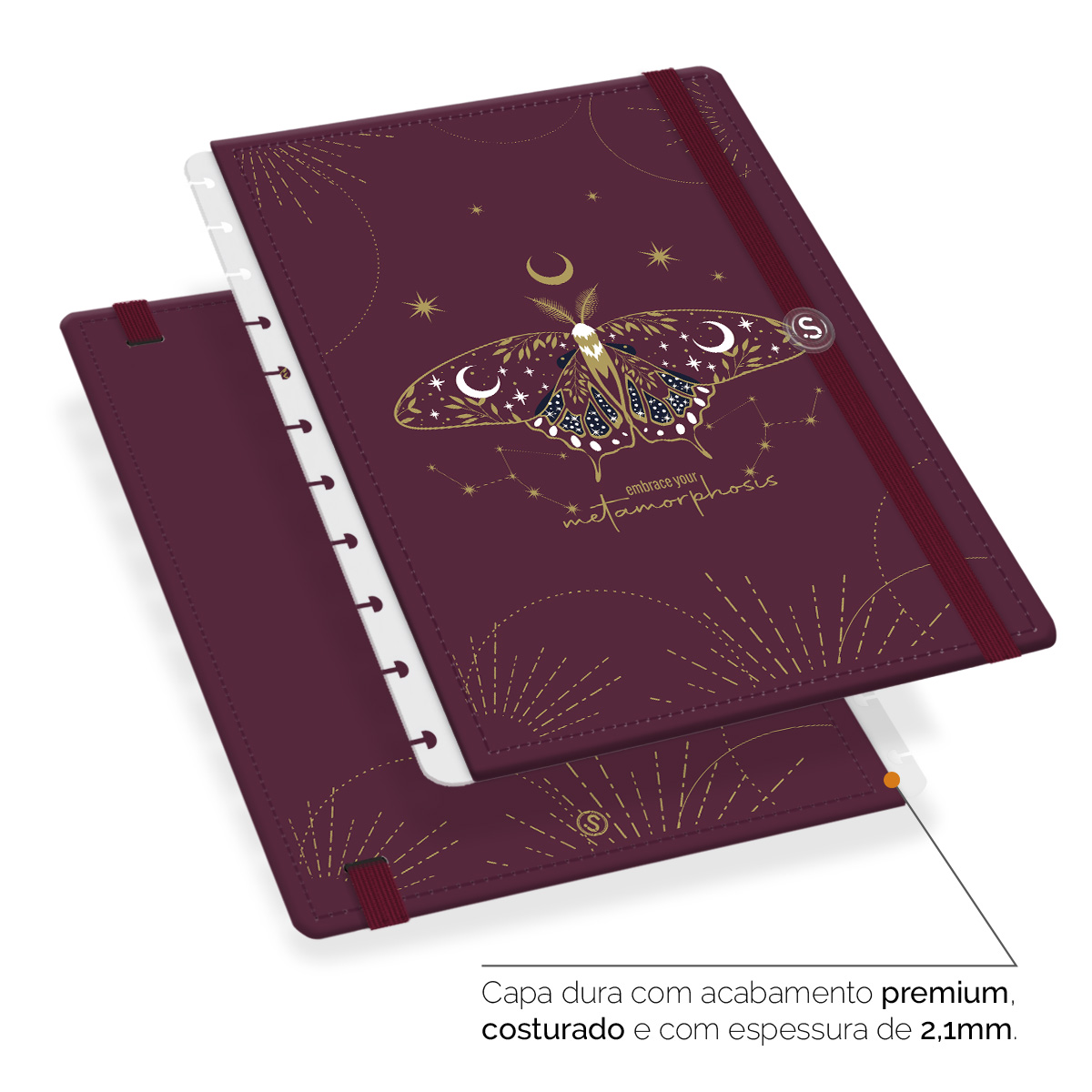 - Capa dura com acabamento premium, costurada e com espessura de 2,1 mm.