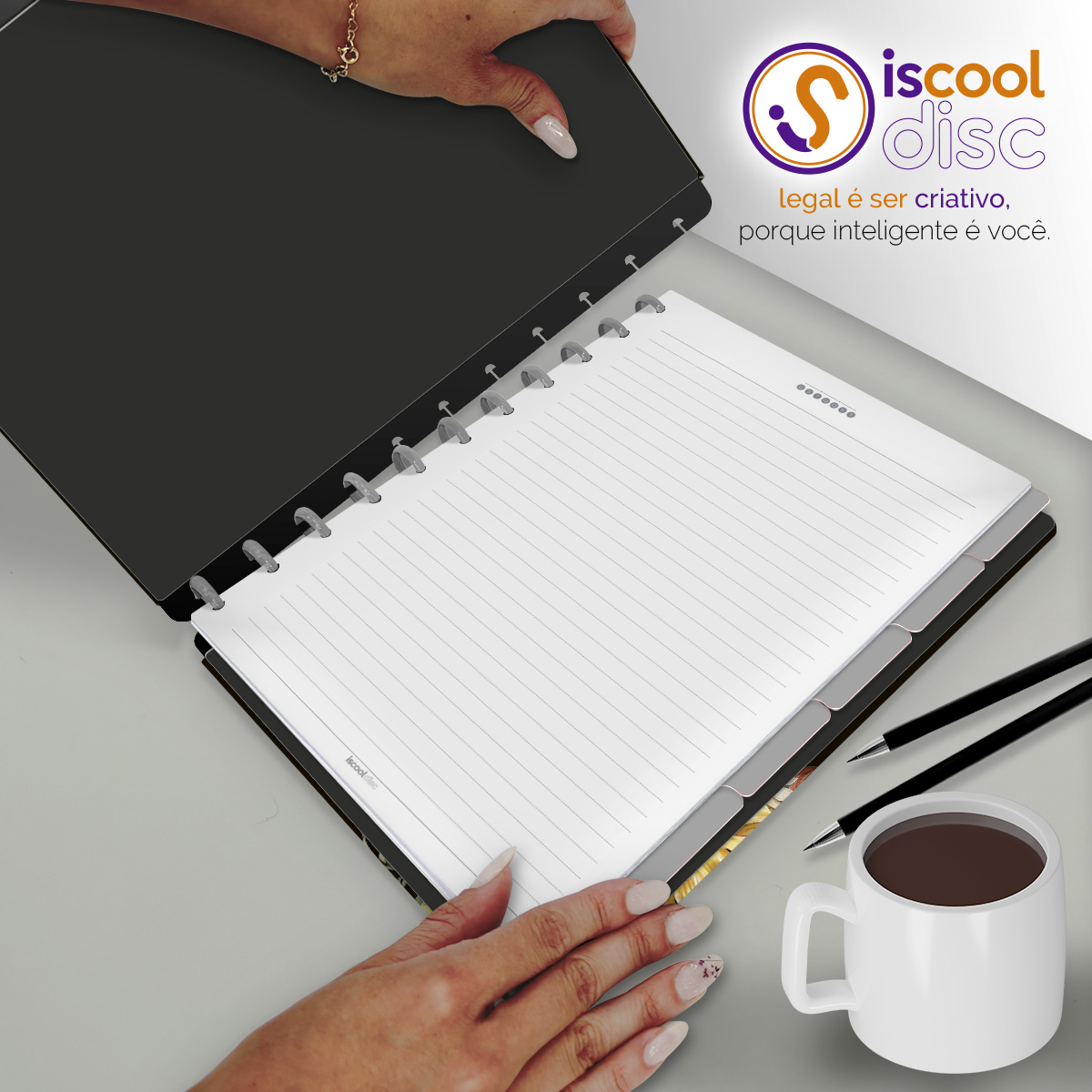 Com furos no formato de "cogumelo", é compatível com outros fabricantes de cadernos de disco, inclusive da marca Caderno Inteligente®.