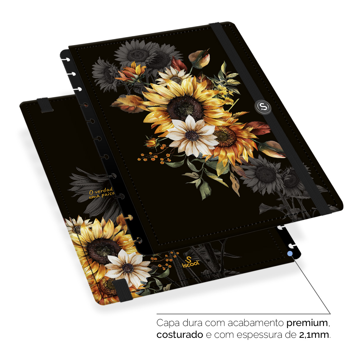 - Capa dura com acabamento premium, costurada e com espessura de 2,1 mm.