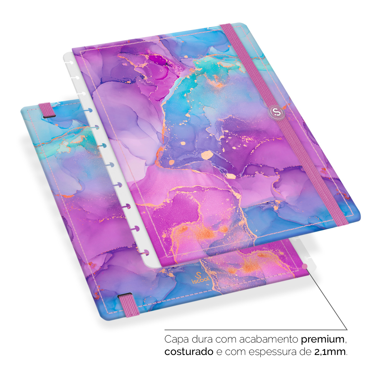 - Capa dura com acabamento premium, costurada e com espessura de 2,1 mm.