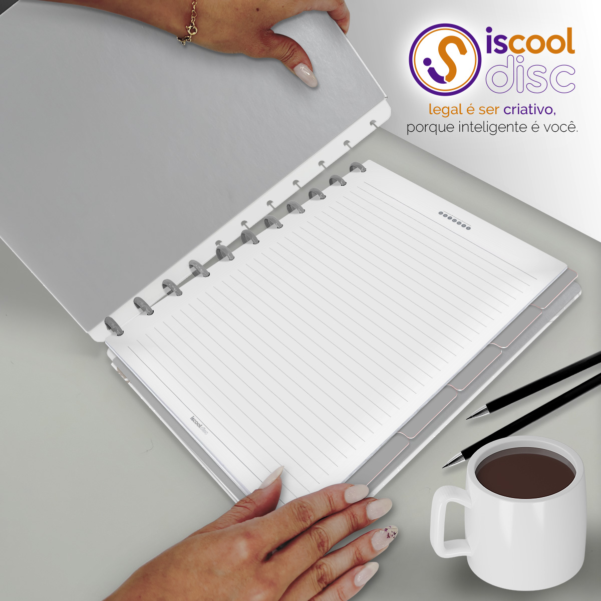 Com furos no formato de "cogumelo", é compatível com outros fabricantes de cadernos de disco, inclusive da marca Caderno Inteligente®.