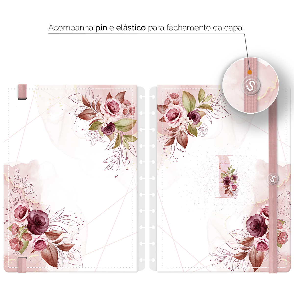 Capa e Contracapa Iscool Disc Monograma Floral Branco E Rosa Letra I