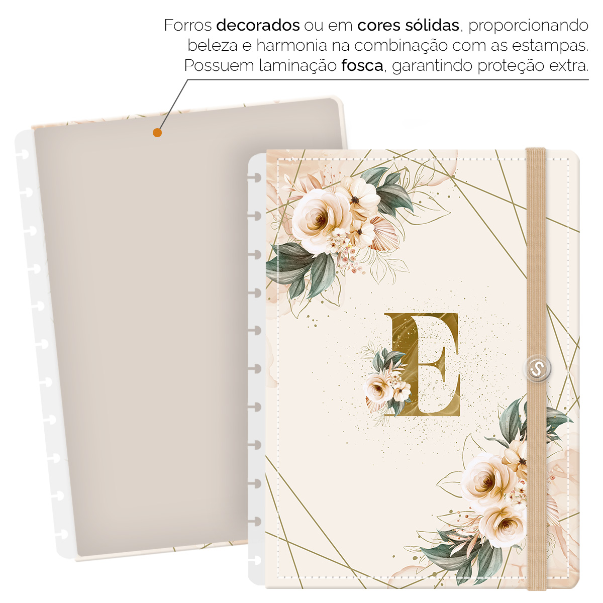 Capa e Contracapa Iscool Disc Monograma Floral Nude e Dourado Letra E