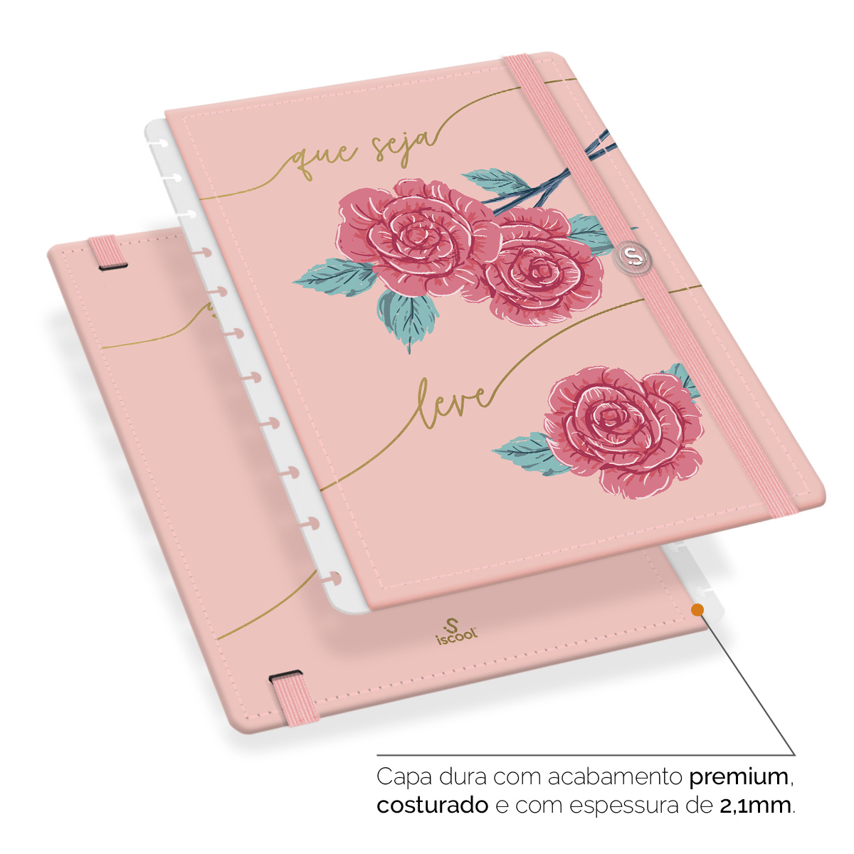 - Capa dura com acabamento premium, costurada e com espessura de 2,1 mm.