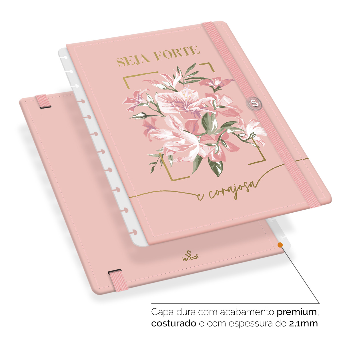 - Capa dura com acabamento premium, costurada e com espessura de 2,1 mm.