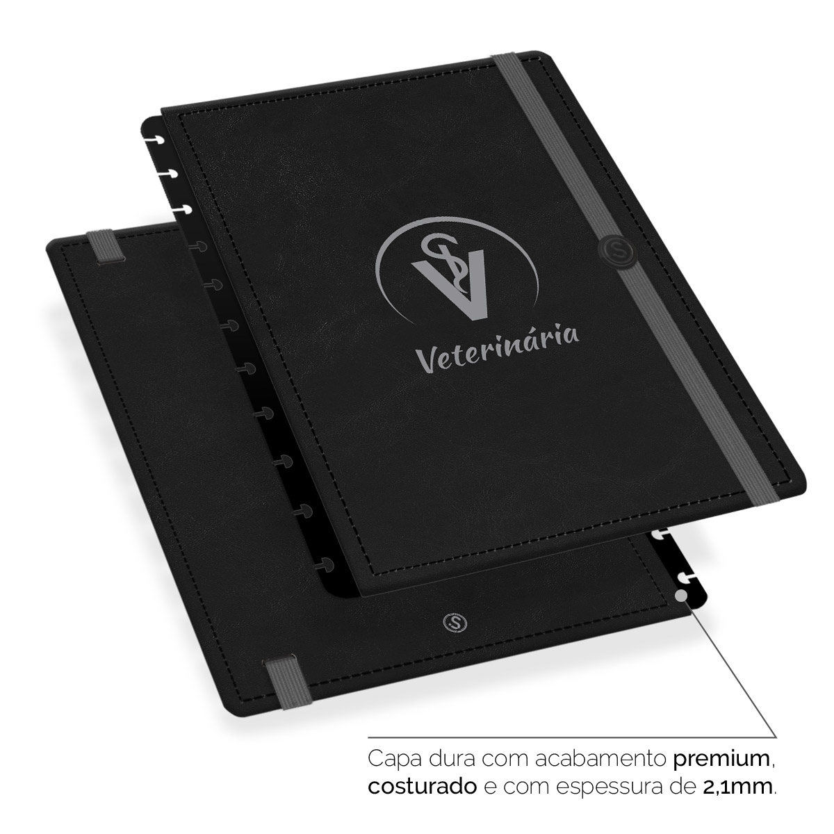 - Capa dura com acabamento premium, costurada e com espessura de 2,1 mm.