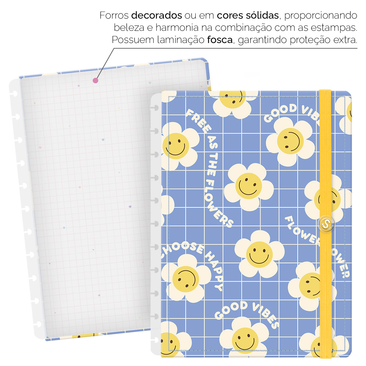 - Forros decorados ou em cores sólidas, com laminação fosca, garantem proteção extra.