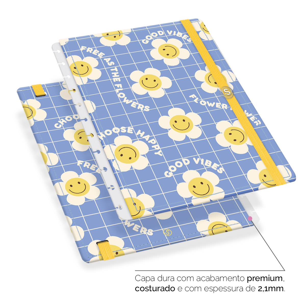 - Capa dura com acabamento premium, costurada e com espessura de 2,1 mm.