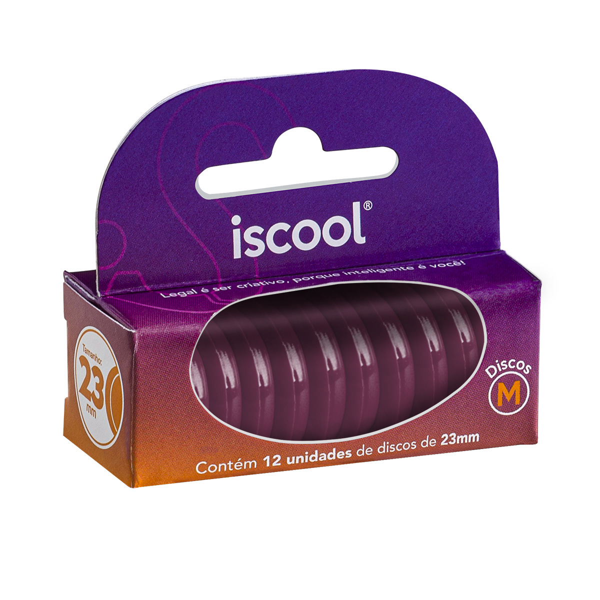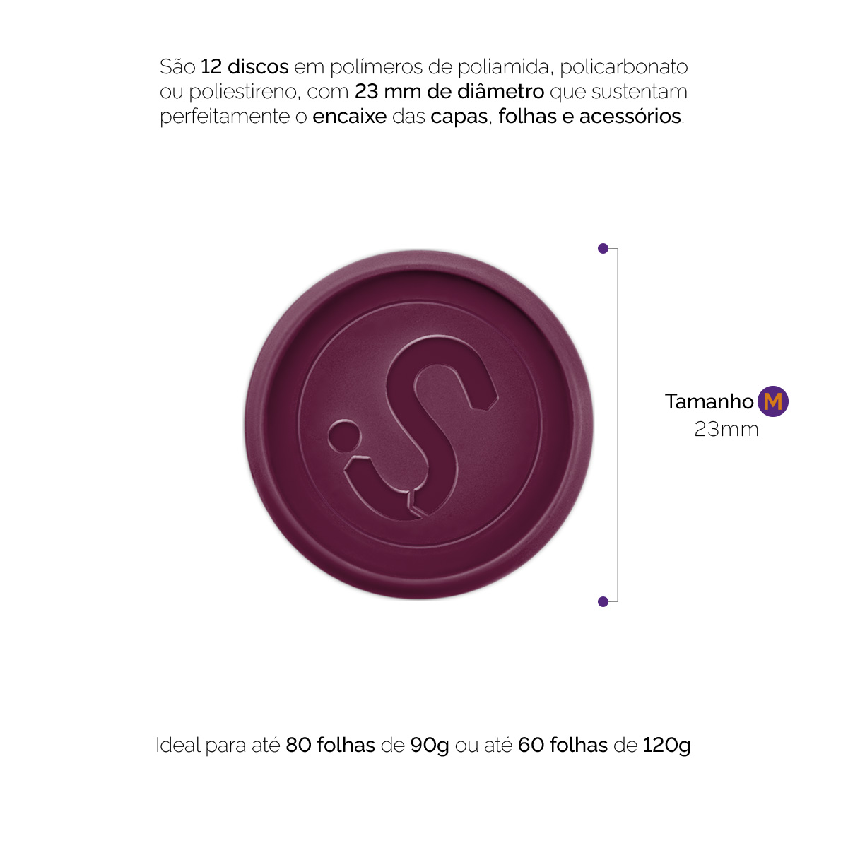 A embalagem contém 12 discos tamanho “M” com 23 mm de diâmetro, fabricados em polímero de poliamida, policarbonato e/ou poliestireno. Produto 100% nacional.