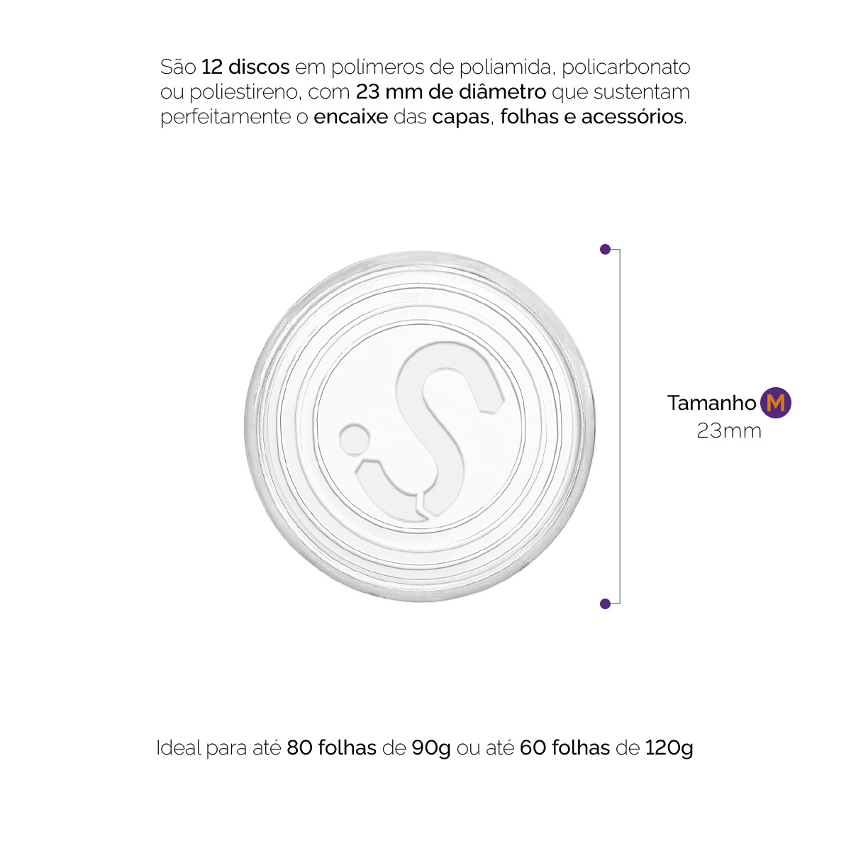 A embalagem contém 12 discos tamanho “M” com 23 mm de diâmetro, fabricados em polímero de poliamida, policarbonato e/ou poliestireno. Produto 100% nacional.