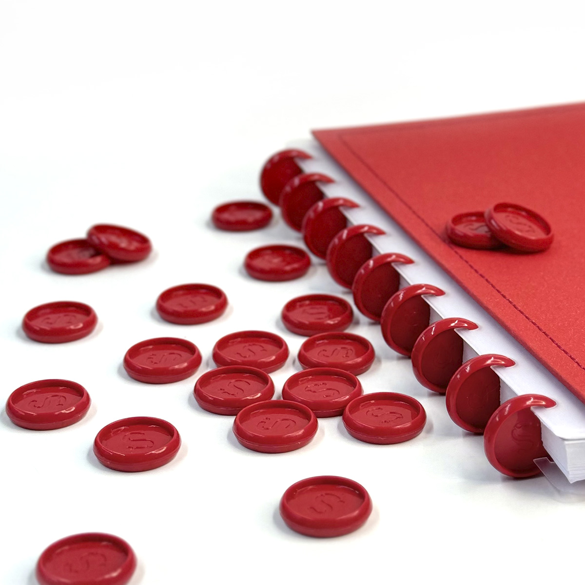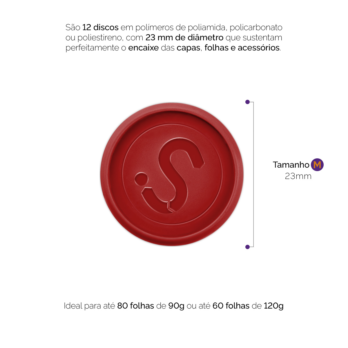 Os nossos discos de 23 mm suportam até 80 folhas de 90 g ou 60 folhas de 120 g e são compatíveis com outros fabricantes de cadernos de disco, inclusive da marca Caderno Inteligente®.
