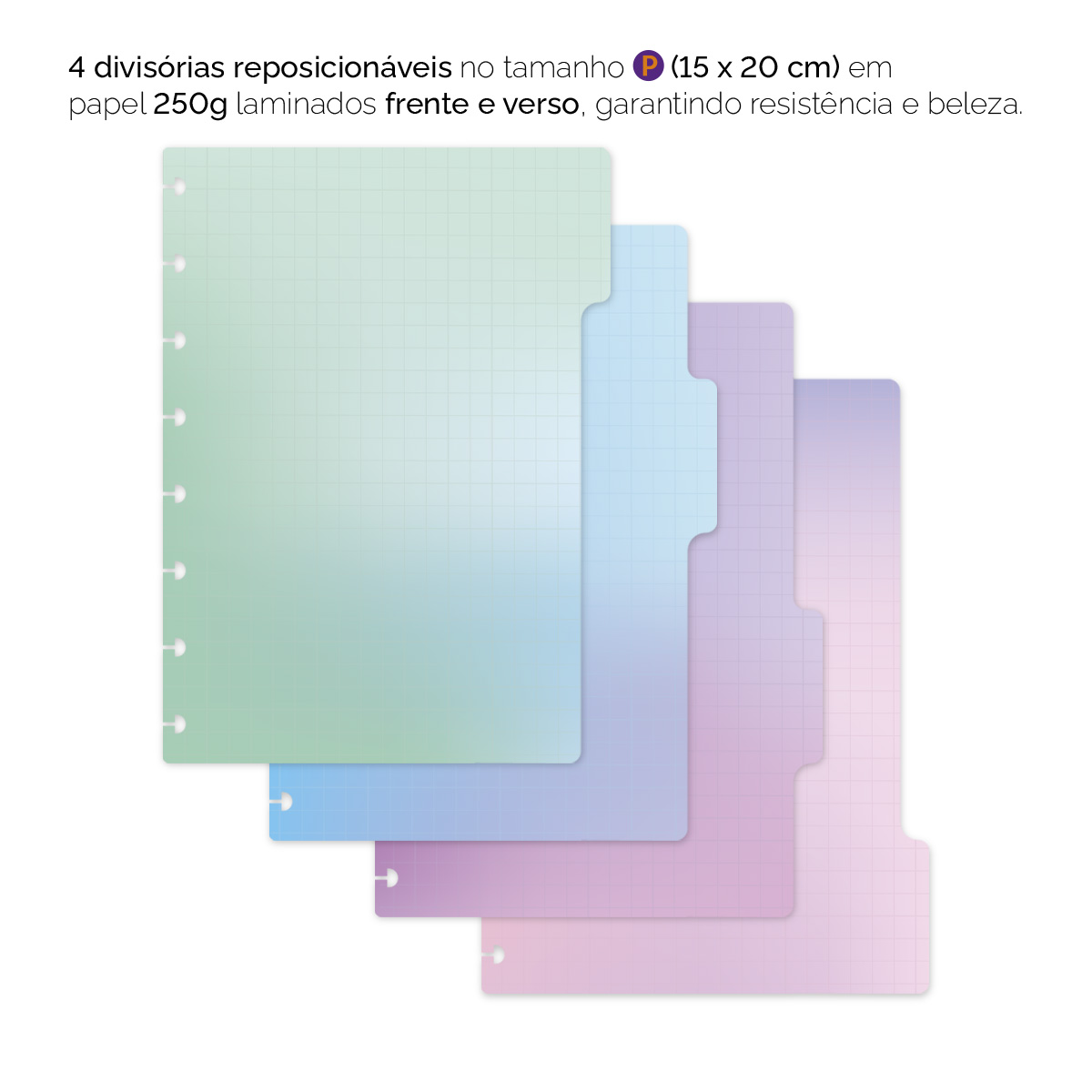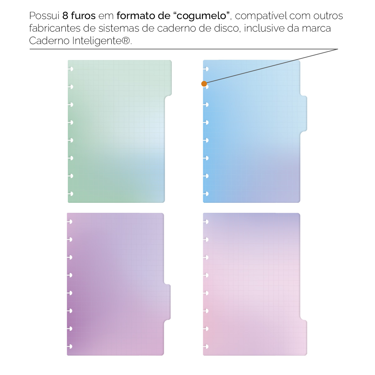 A embalagem contém 6 divisórias no tamanho “G” (21 x 27,5 cm) que podem ser colocadas em qualquer local do caderno. Elas são impressas com tecnologia digital de alta qualidade em papel couché 250 g, com laminação frente e verso, o que as torna mais protegidas e resistentes.