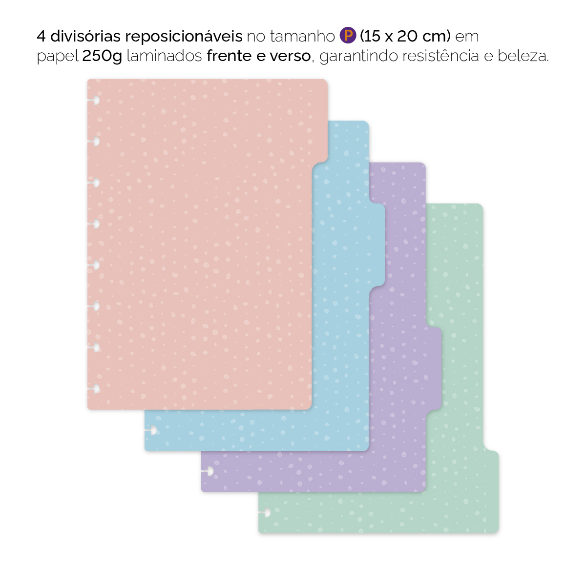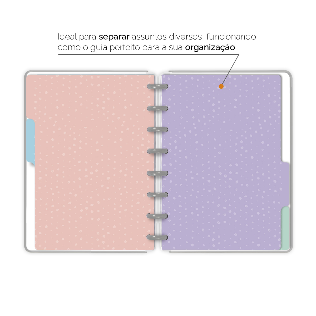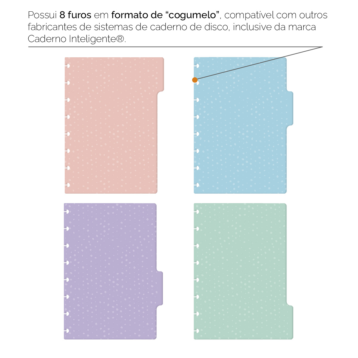 A embalagem contém 6 divisórias no tamanho “G” (21 x 27,5 cm) que podem ser colocadas em qualquer local do caderno. Elas são impressas com tecnologia digital de alta qualidade em papel couché 250 g, com laminação frente e verso, o que as torna mais protegidas e resistentes.