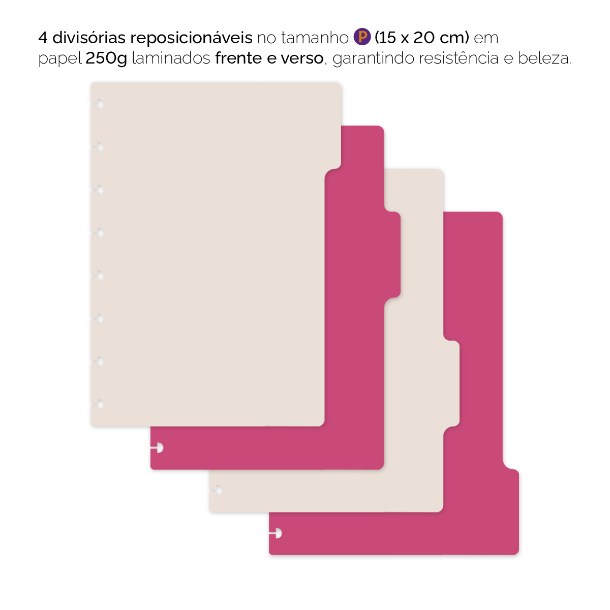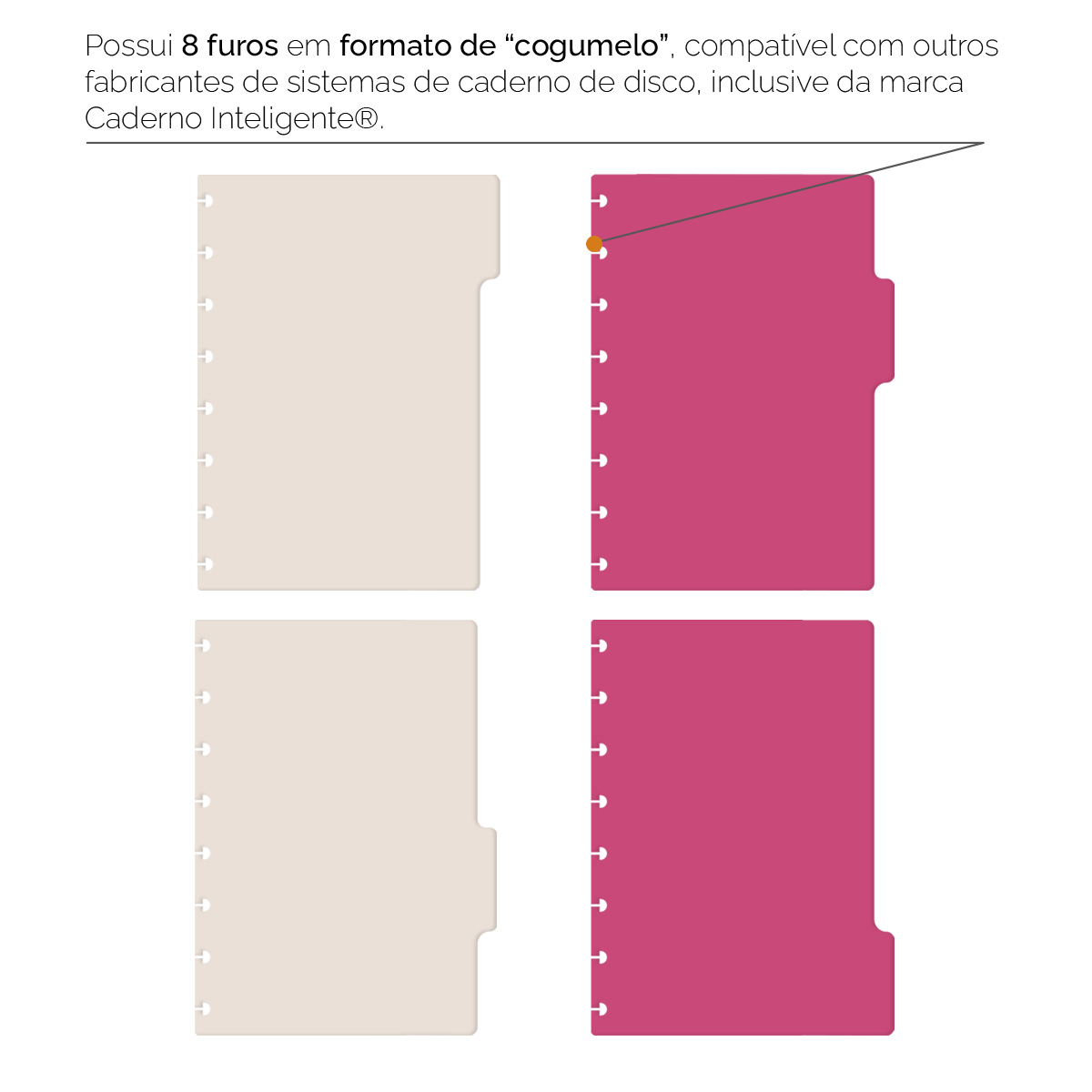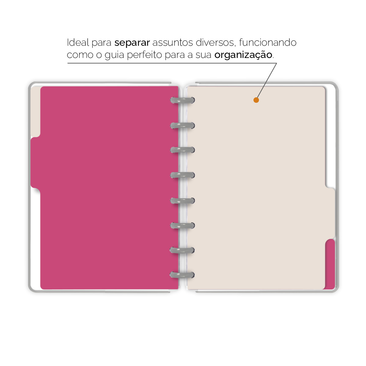A embalagem contém 6 divisórias no tamanho “G” (21 x 27,5 cm) que podem ser colocadas em qualquer local do caderno. Elas são impressas com tecnologia digital de alta qualidade em papel couché 250 g, com laminação frente e verso, o que as torna mais protegidas e resistentes.