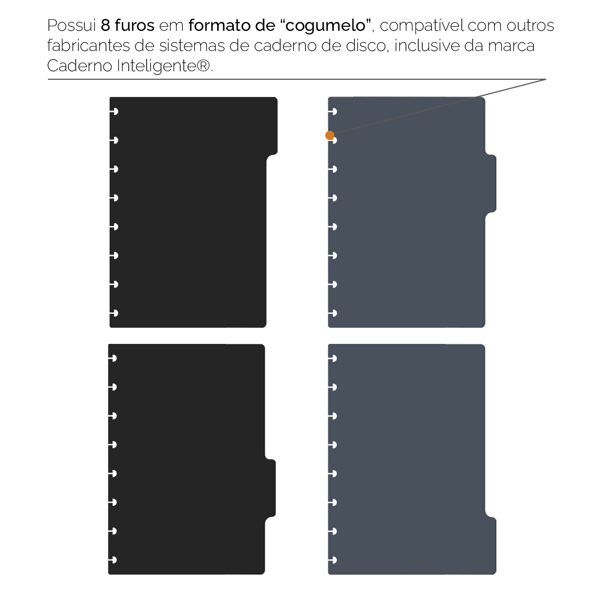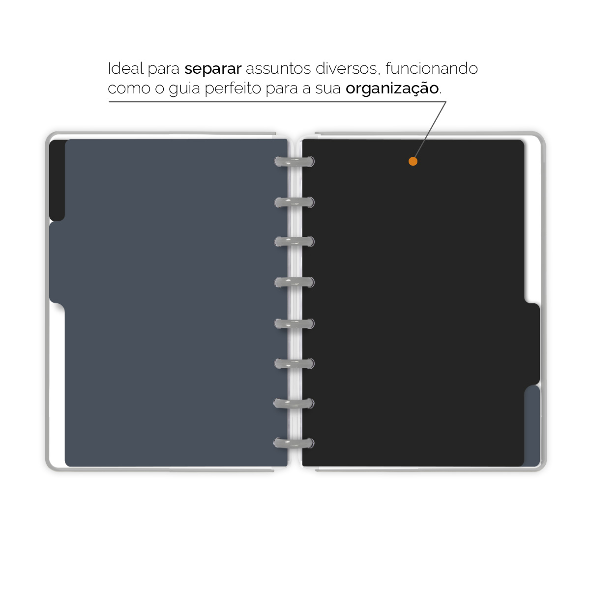 A embalagem contém 6 divisórias no tamanho “G” (21 x 27,5 cm) que podem ser colocadas em qualquer local do caderno. Elas são impressas com tecnologia digital de alta qualidade em papel couché 250 g, com laminação frente e verso, o que as torna mais protegidas e resistentes.
