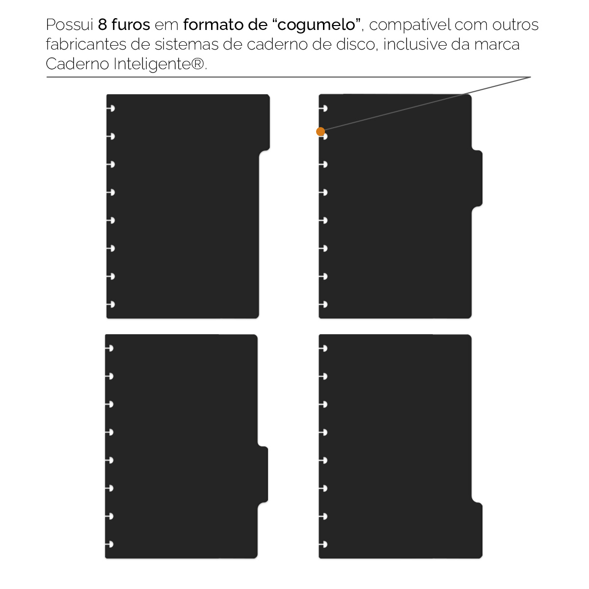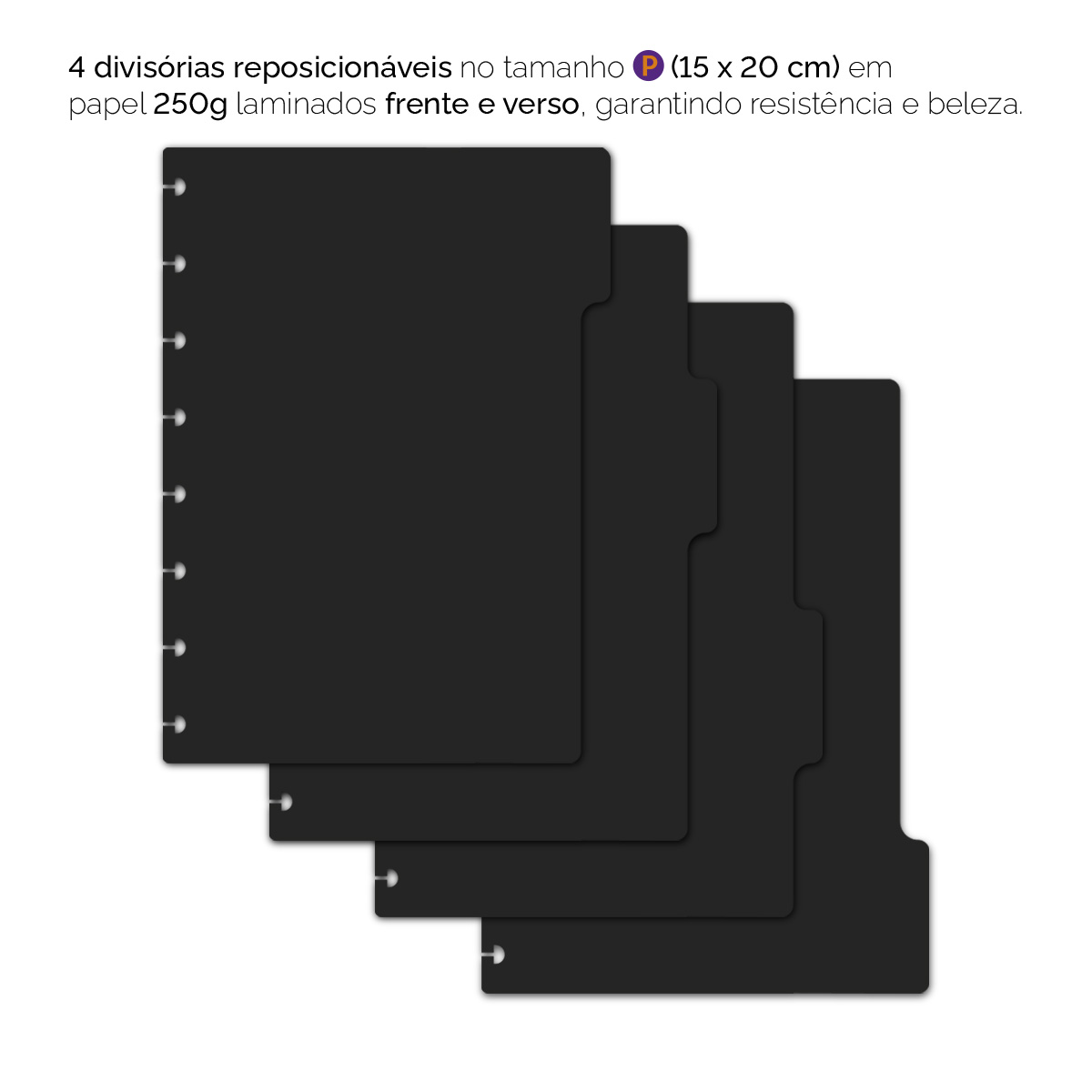 A embalagem contém 6 divisórias no tamanho “G” (21 x 27,5 cm) que podem ser colocadas em qualquer local do caderno. Elas são impressas com tecnologia digital de alta qualidade em papel couché 250 g, com laminação frente e verso, o que as torna mais protegidas e resistentes.