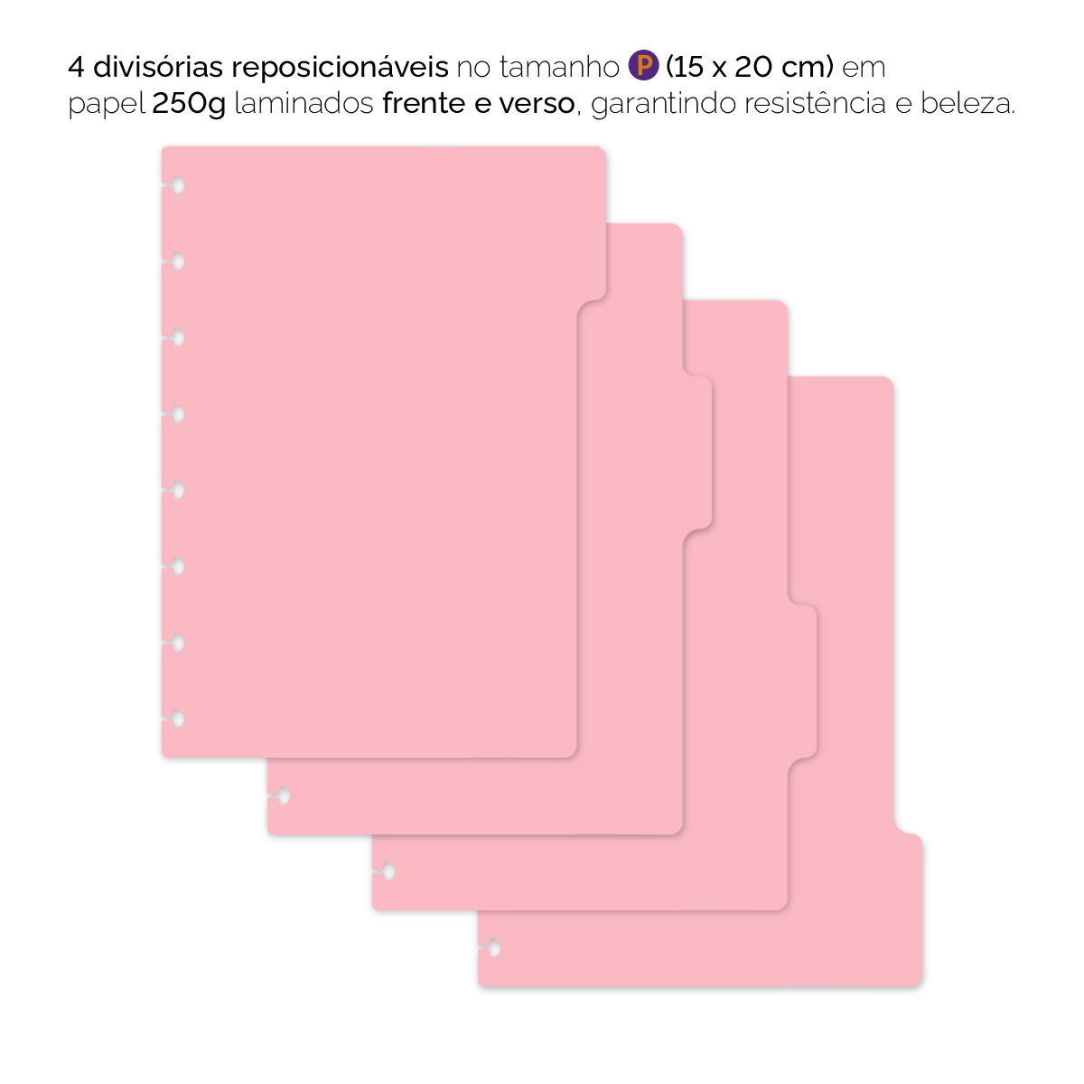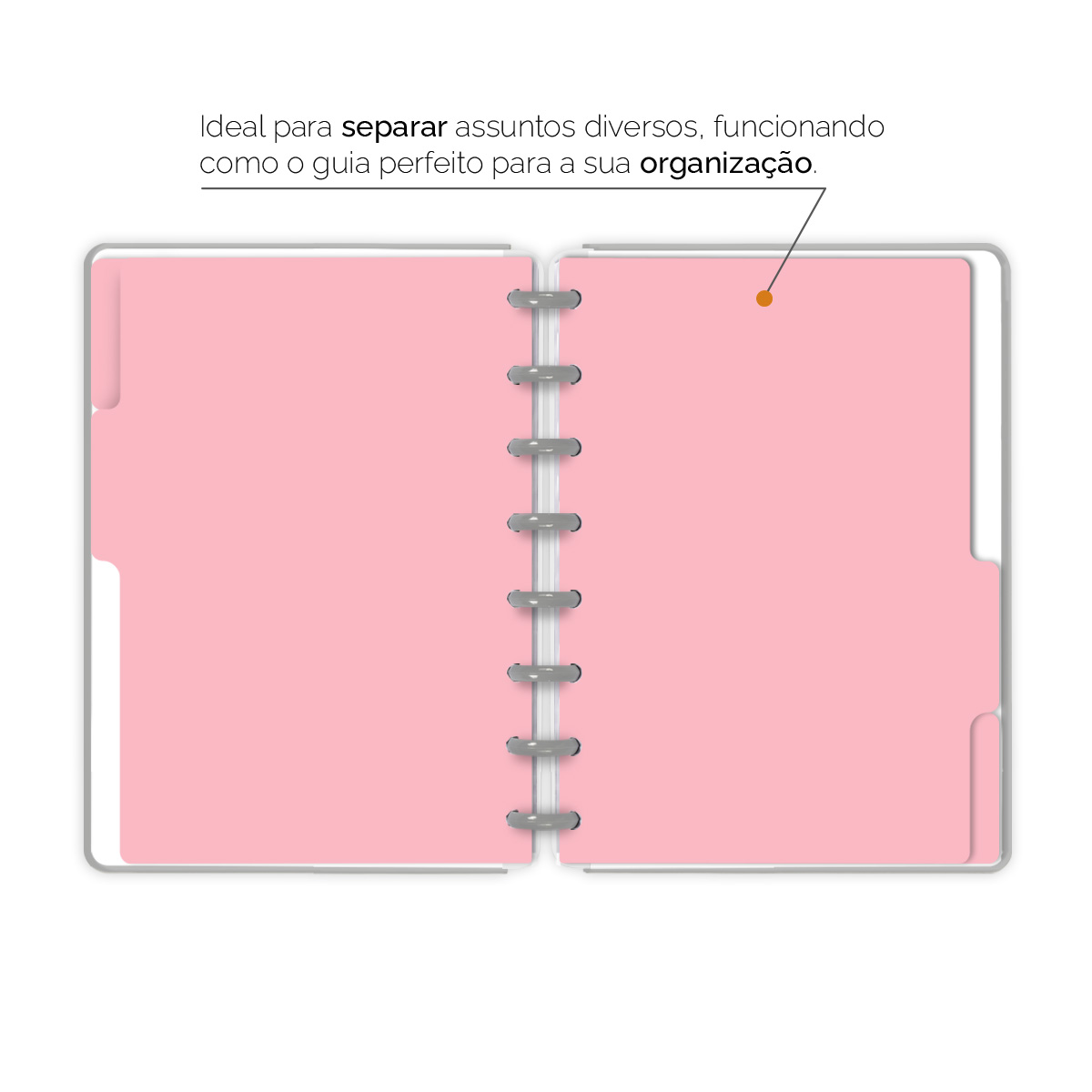 A embalagem contém 6 divisórias no tamanho “G” (21 x 27,5 cm) que podem ser colocadas em qualquer local do caderno. Elas são impressas com tecnologia digital de alta qualidade em papel couché 250 g, com laminação frente e verso, o que as torna mais protegidas e resistentes.