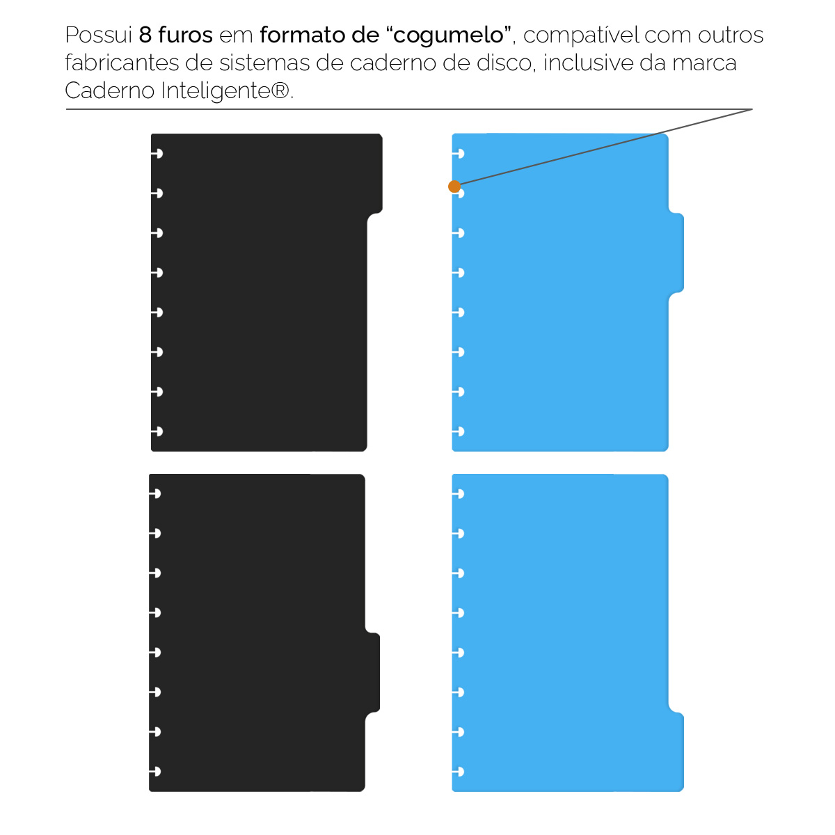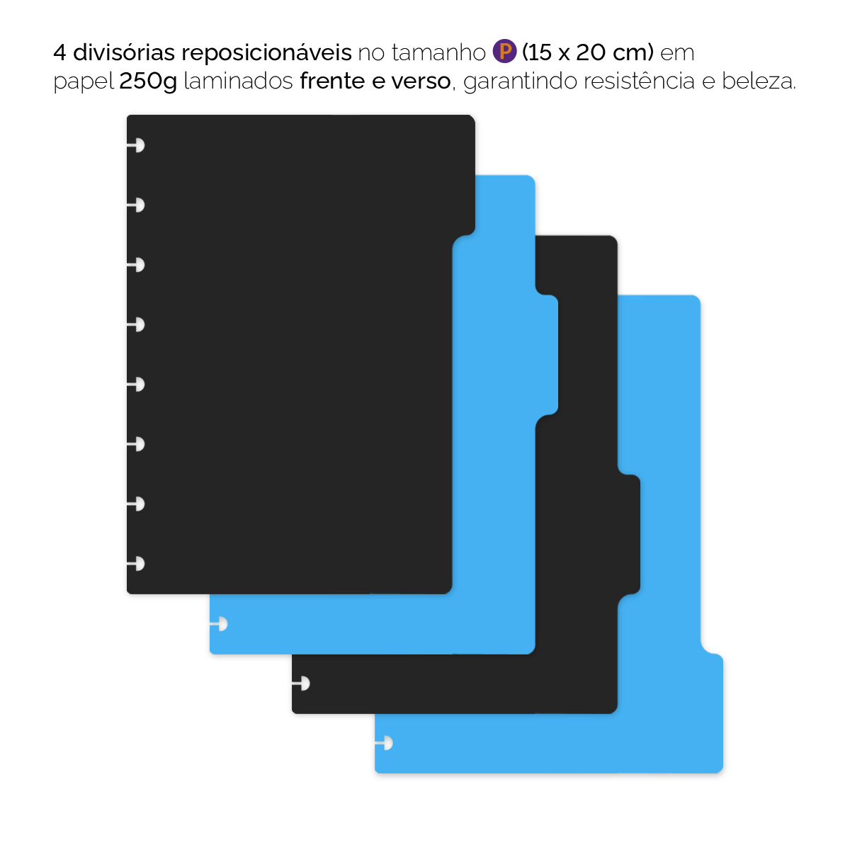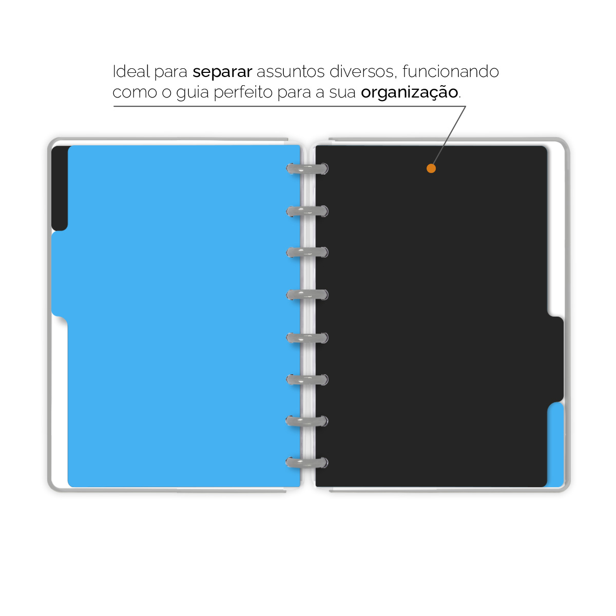 A embalagem contém 6 divisórias no tamanho “G” (21 x 27,5 cm) que podem ser colocadas em qualquer local do caderno. Elas são impressas com tecnologia digital de alta qualidade em papel couché 250 g, com laminação frente e verso, o que as torna mais protegidas e resistentes.