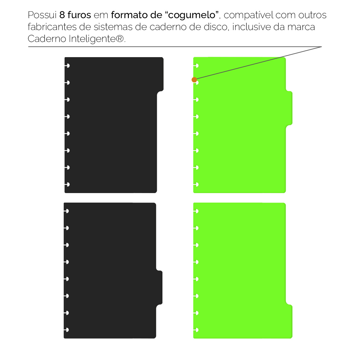 A embalagem contém 6 divisórias no tamanho “G” (21 x 27,5 cm) que podem ser colocadas em qualquer local do caderno. Elas são impressas com tecnologia digital de alta qualidade em papel couché 250 g, com laminação frente e verso, o que as torna mais protegidas e resistentes.