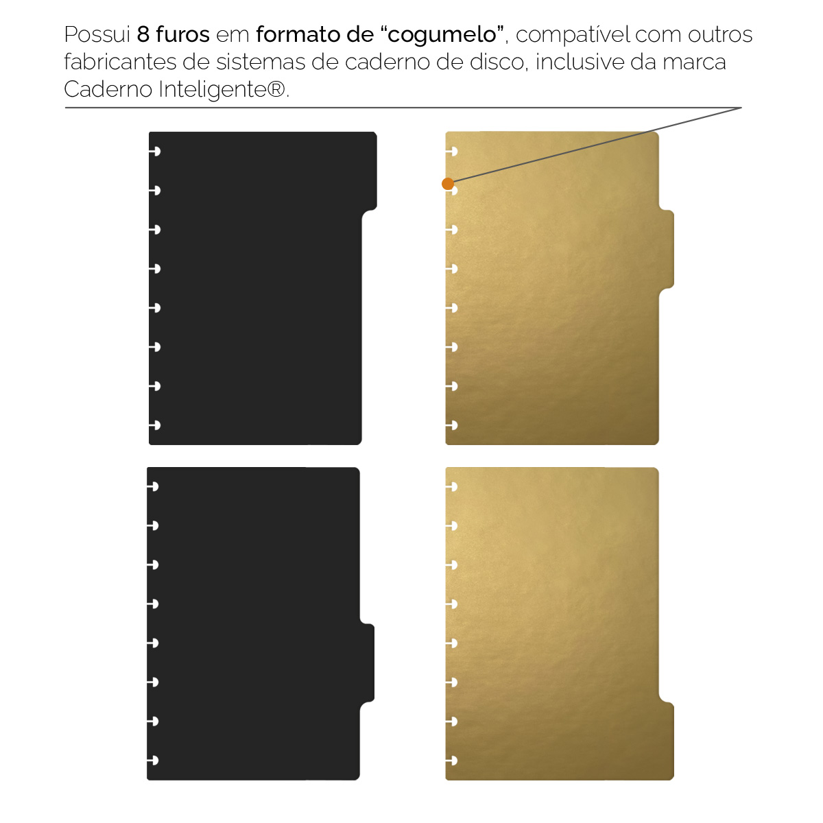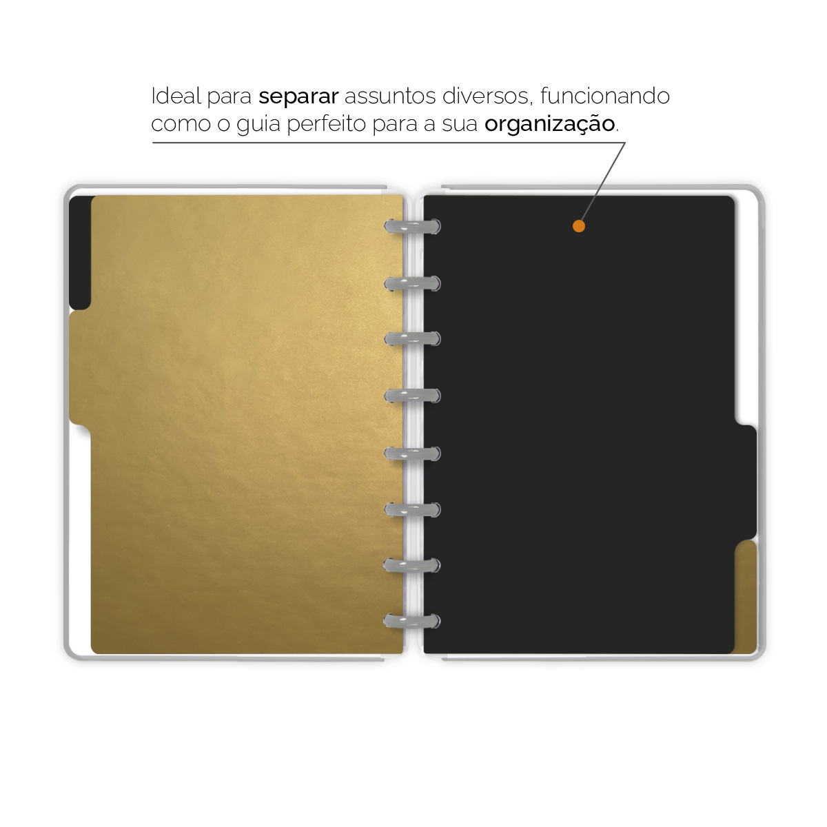 A embalagem contém 6 divisórias no tamanho “G” (21 x 27,5 cm) que podem ser colocadas em qualquer local do caderno. Elas são impressas com tecnologia digital de alta qualidade em papel couché 250 g, com laminação frente e verso, o que as torna mais protegidas e resistentes.