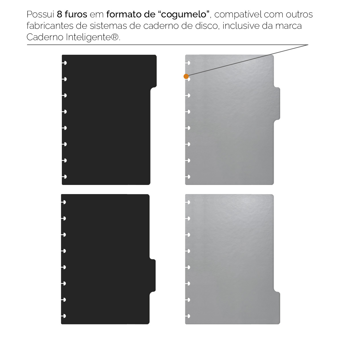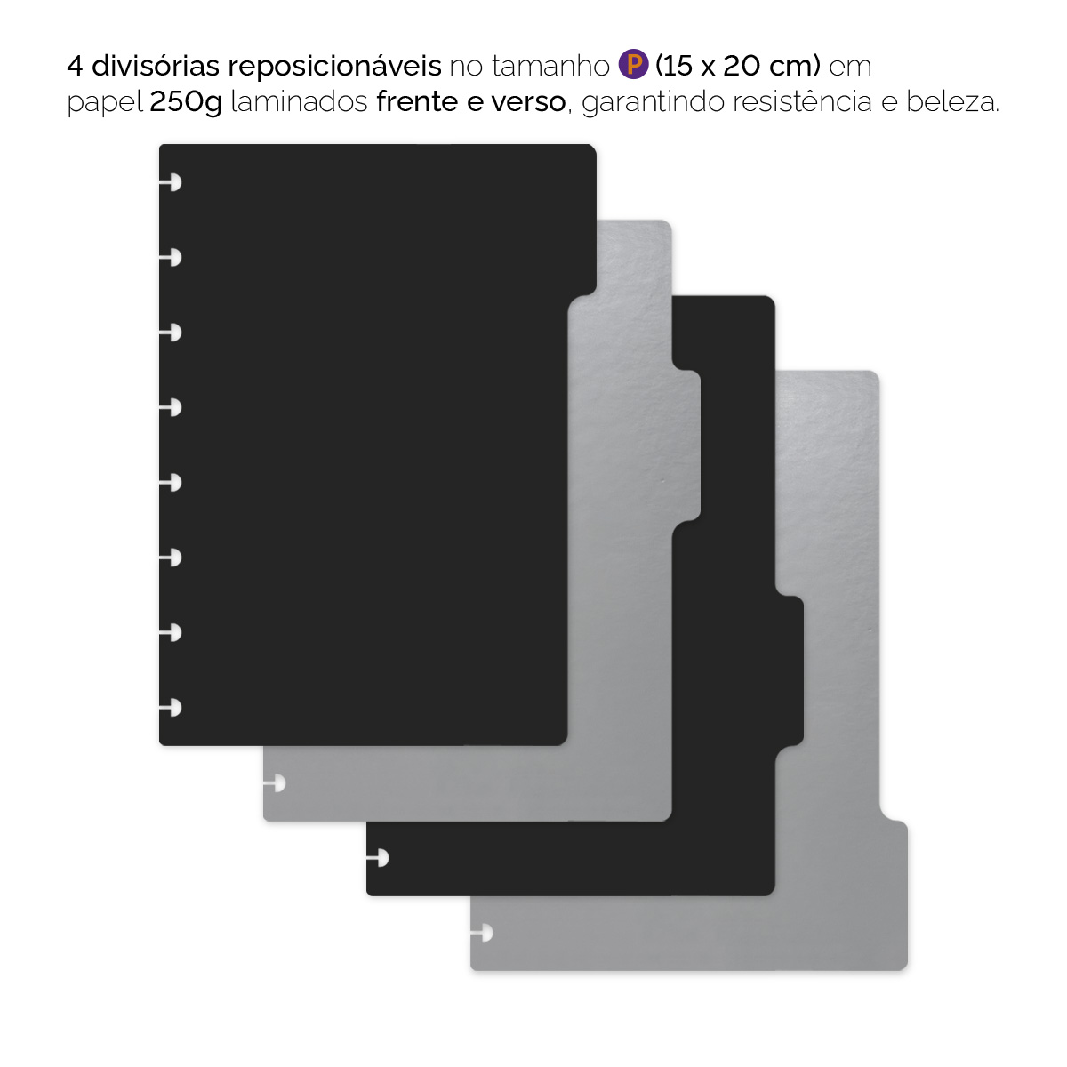 A embalagem contém 6 divisórias no tamanho “G” (21 x 27,5 cm) que podem ser colocadas em qualquer local do caderno. Elas são impressas com tecnologia digital de alta qualidade em papel couché 250 g, com laminação frente e verso, o que as torna mais protegidas e resistentes.