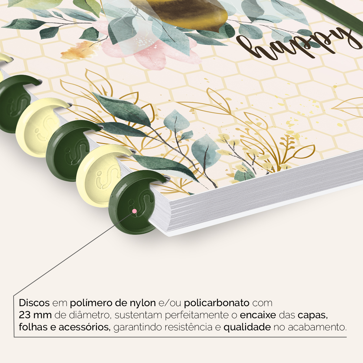 Encadernado com 11 discos M de 23mm em polímero de nylon e/ou policarbonato coloridos, fabricados no Brasil.