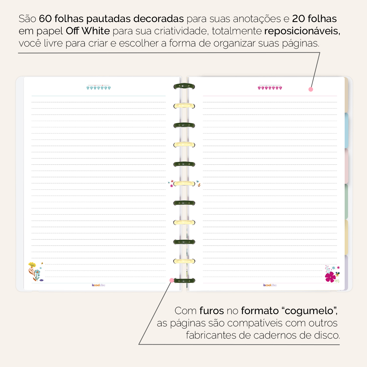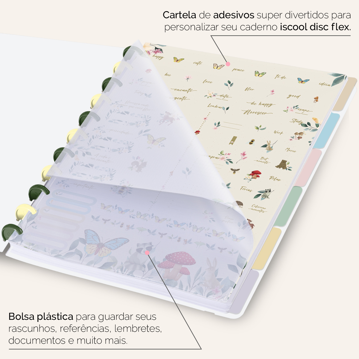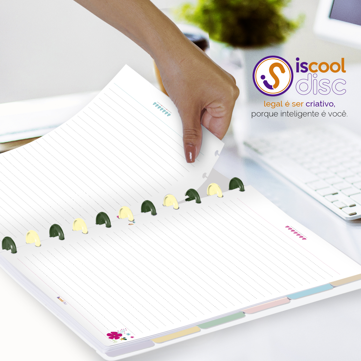 Além de tudo isso, o ISCOOL DISC FLEX, conta com detalhezinhos que fazem toda diferença: elástico removível para fechamento da capa, muito mais estilo e privacidade para suas anotações; bolsa plástica para guardar seus rascunhos, referências, lembretes, documentos e uma cartela de adesivos incríveis, para que você possa personalizar seu caderno do seu jeitinho!