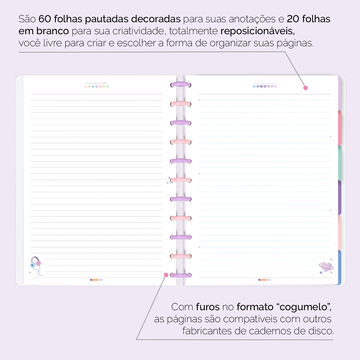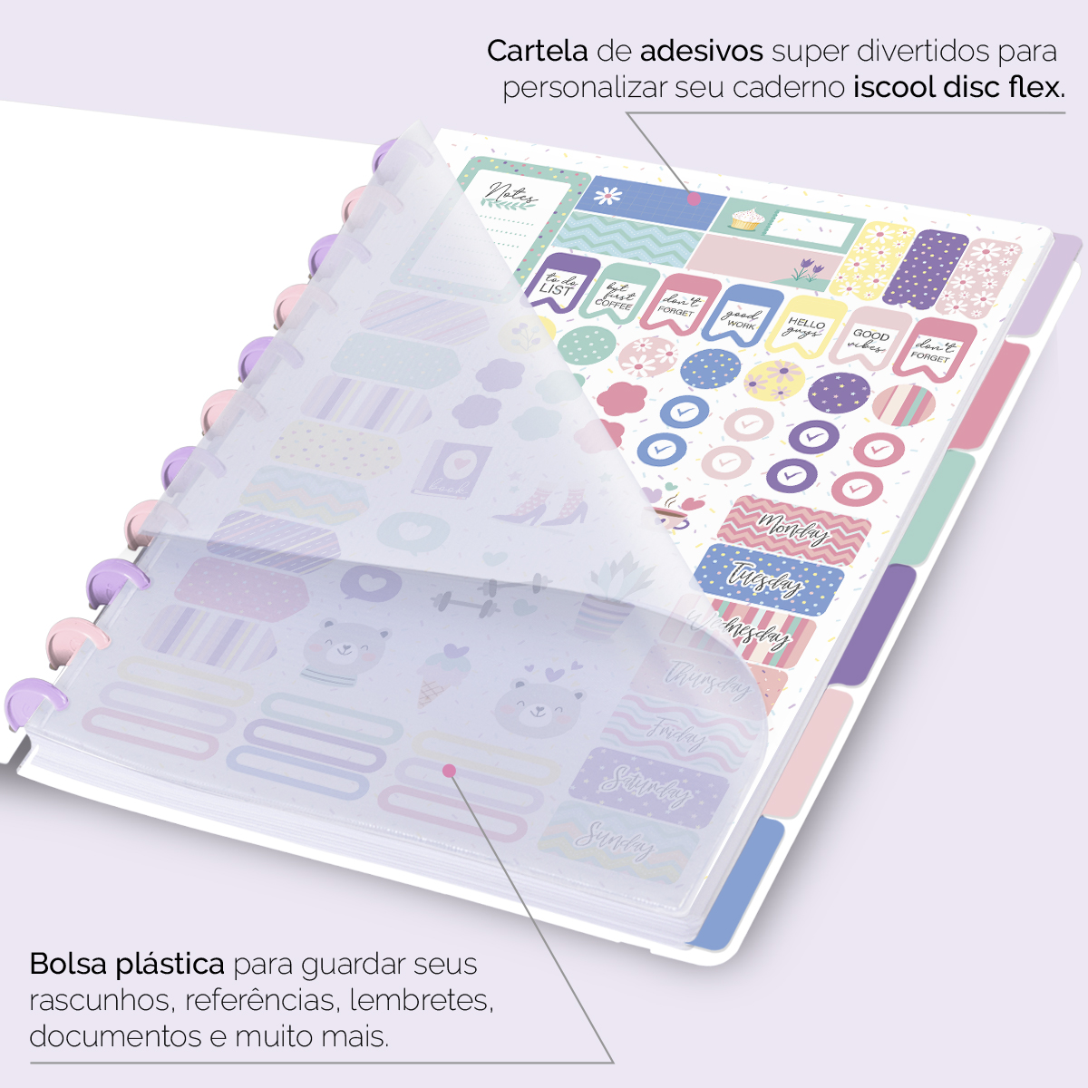 Além de tudo isso, o ISCOOL DISC FLEX, conta com detalhezinhos que fazem toda diferença: elástico removível para fechamento da capa, muito mais estilo e privacidade para suas anotações; bolsa plástica para guardar seus rascunhos, referências, lembretes, documentos e uma cartela de adesivos incríveis, para que você possa personalizar seu caderno do seu jeitinho!