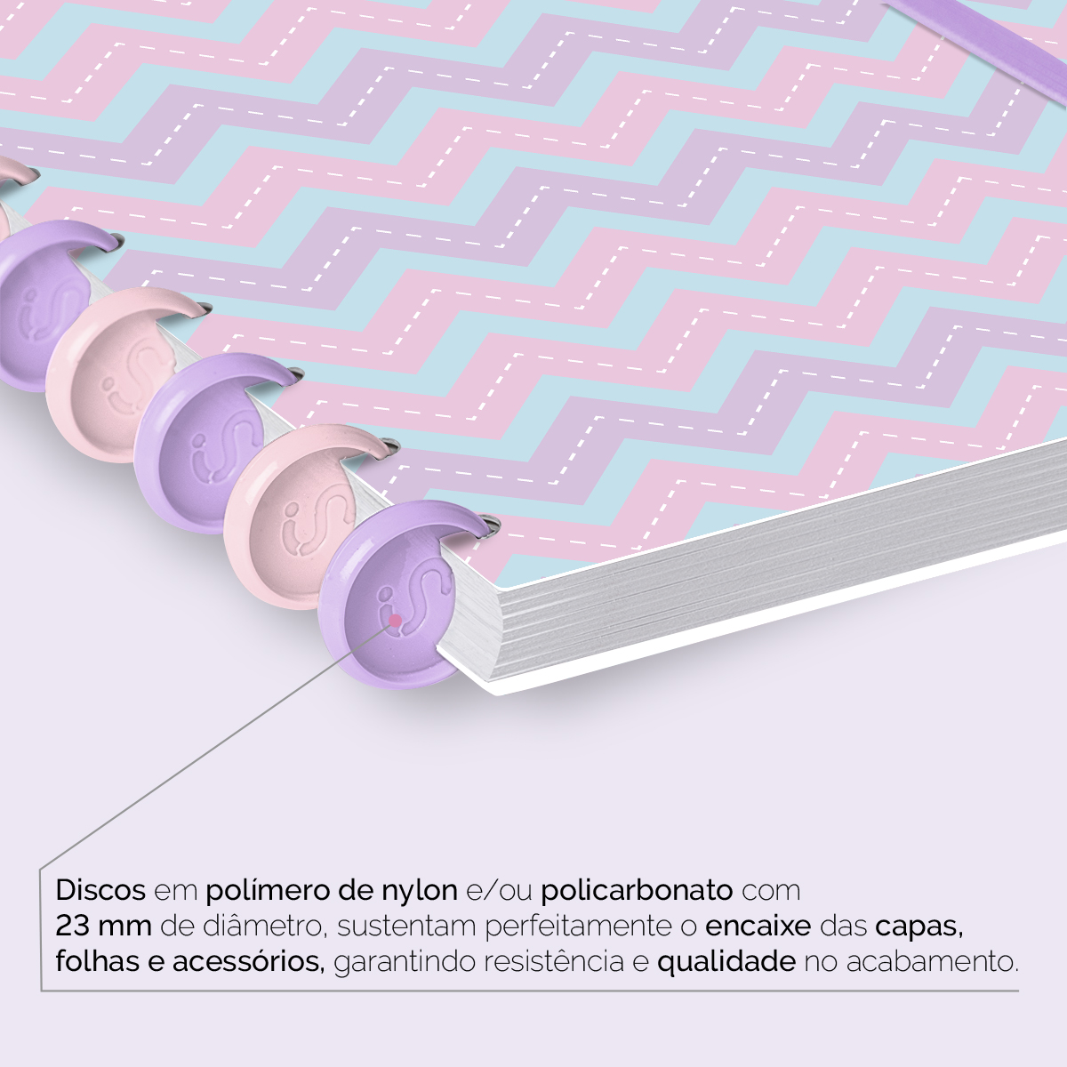 Encadernado com 11 discos M de 23mm em polímero de nylon e/ou policarbonato coloridos, fabricados no Brasil.
