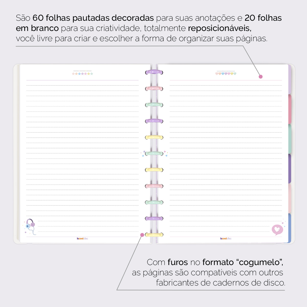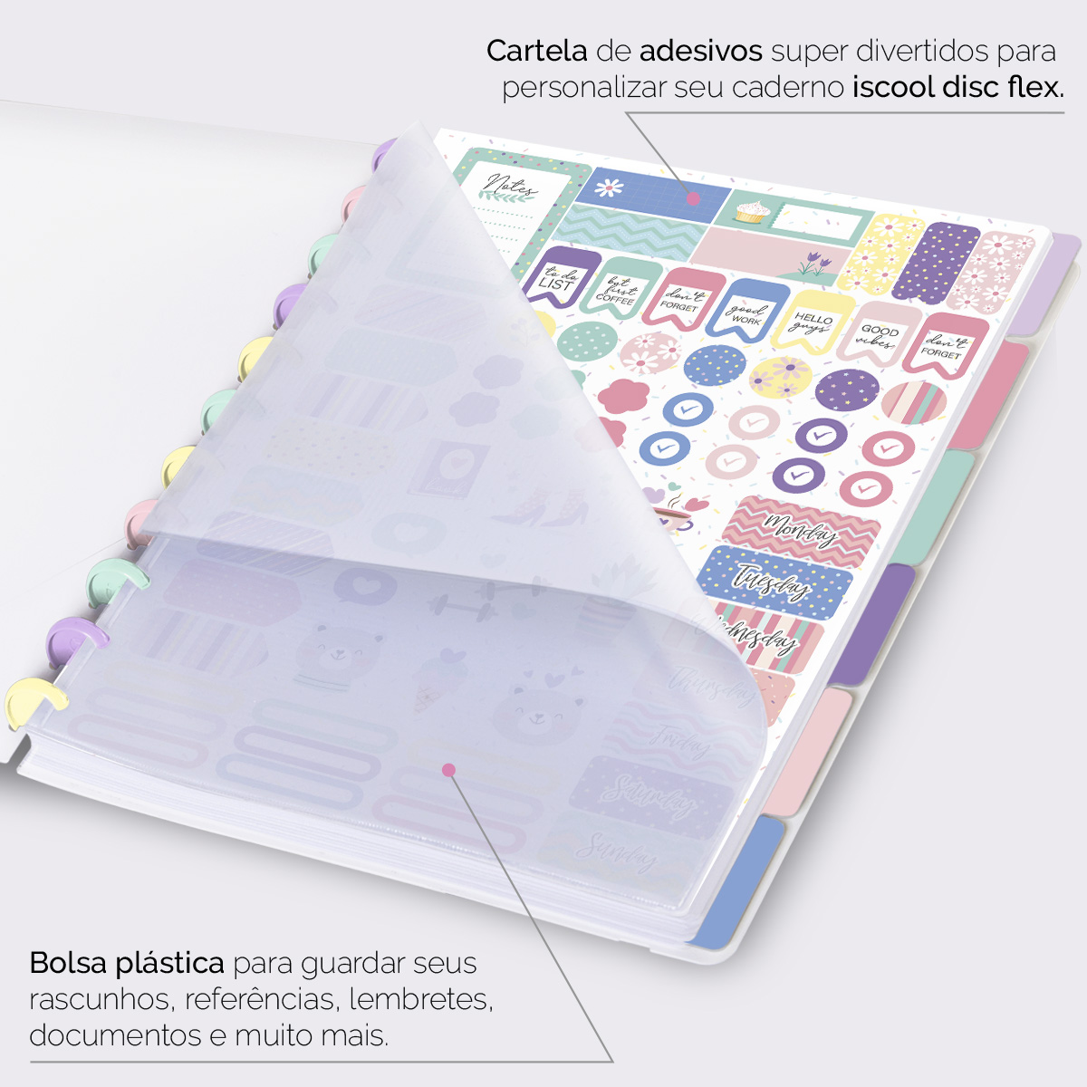 Além de tudo isso, o ISCOOL DISC FLEX, conta com detalhezinhos que fazem toda diferença: elástico removível para fechamento da capa, muito mais estilo e privacidade para suas anotações; bolsa plástica para guardar seus rascunhos, referências, lembretes, documentos e uma cartela de adesivos incríveis, para que você possa personalizar seu caderno do seu jeitinho!