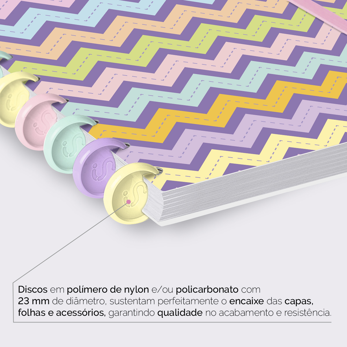Encadernado com 11 discos M de 23mm em polímero de nylon e/ou policarbonato coloridos, fabricados no Brasil.
