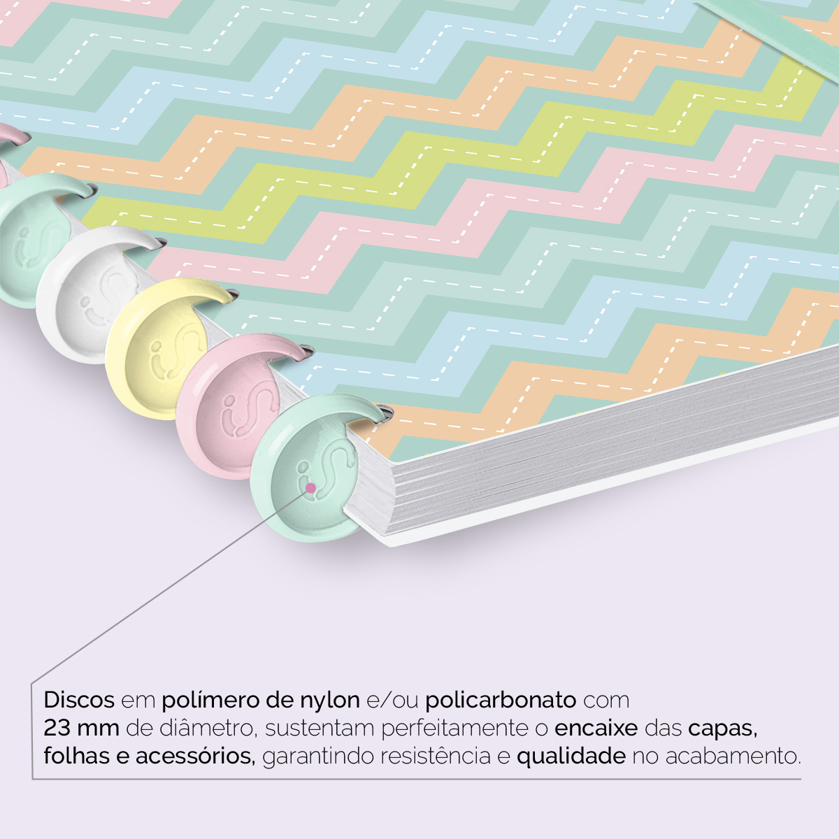 Encadernado com 11 discos M de 23mm em polímero de nylon e/ou policarbonato coloridos, fabricados no Brasil.