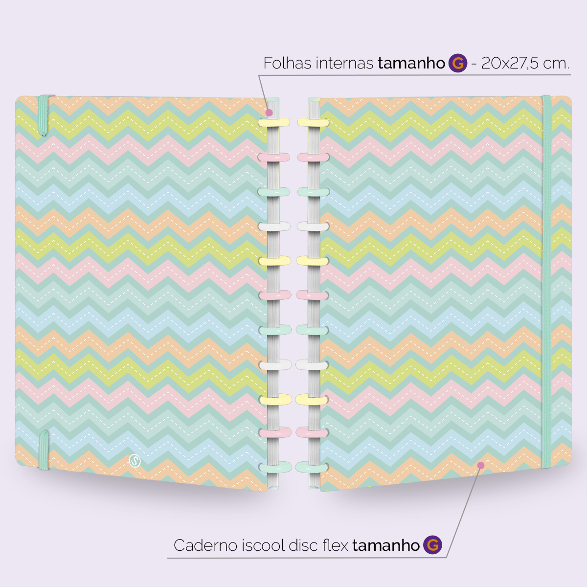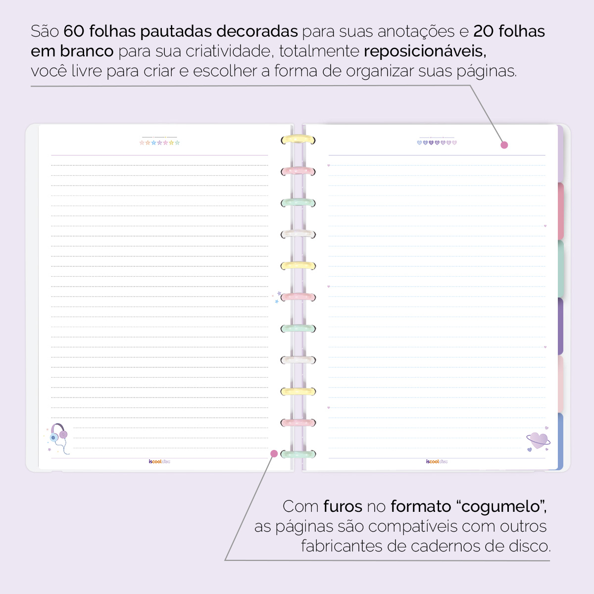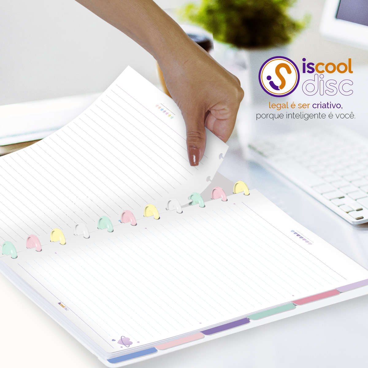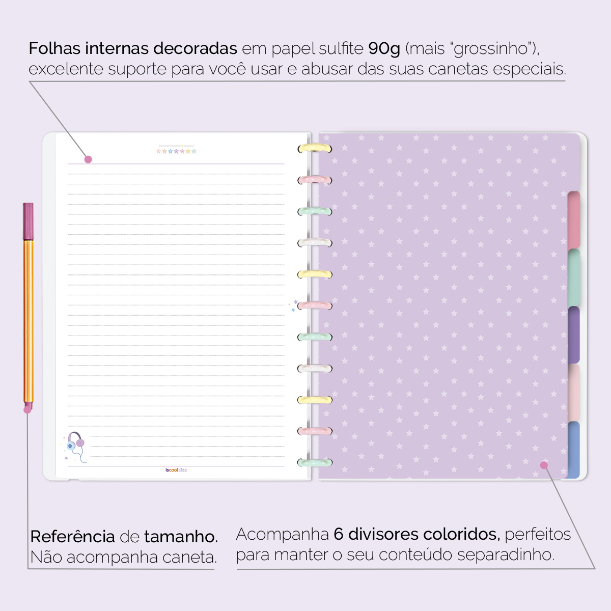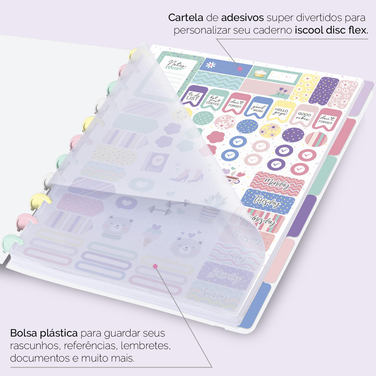 Além de tudo isso, o ISCOOL DISC FLEX, conta com detalhezinhos que fazem toda diferença: elástico removível para fechamento da capa, muito mais estilo e privacidade para suas anotações; bolsa plástica para guardar seus rascunhos, referências, lembretes, documentos e uma cartela de adesivos incríveis, para que você possa personalizar seu caderno do seu jeitinho!