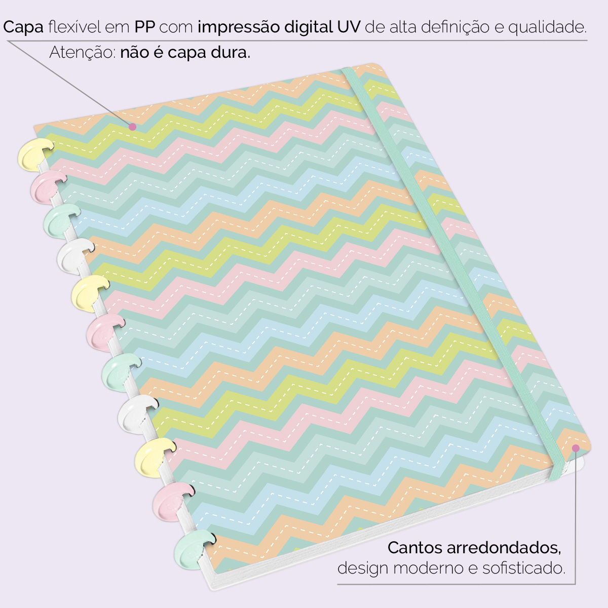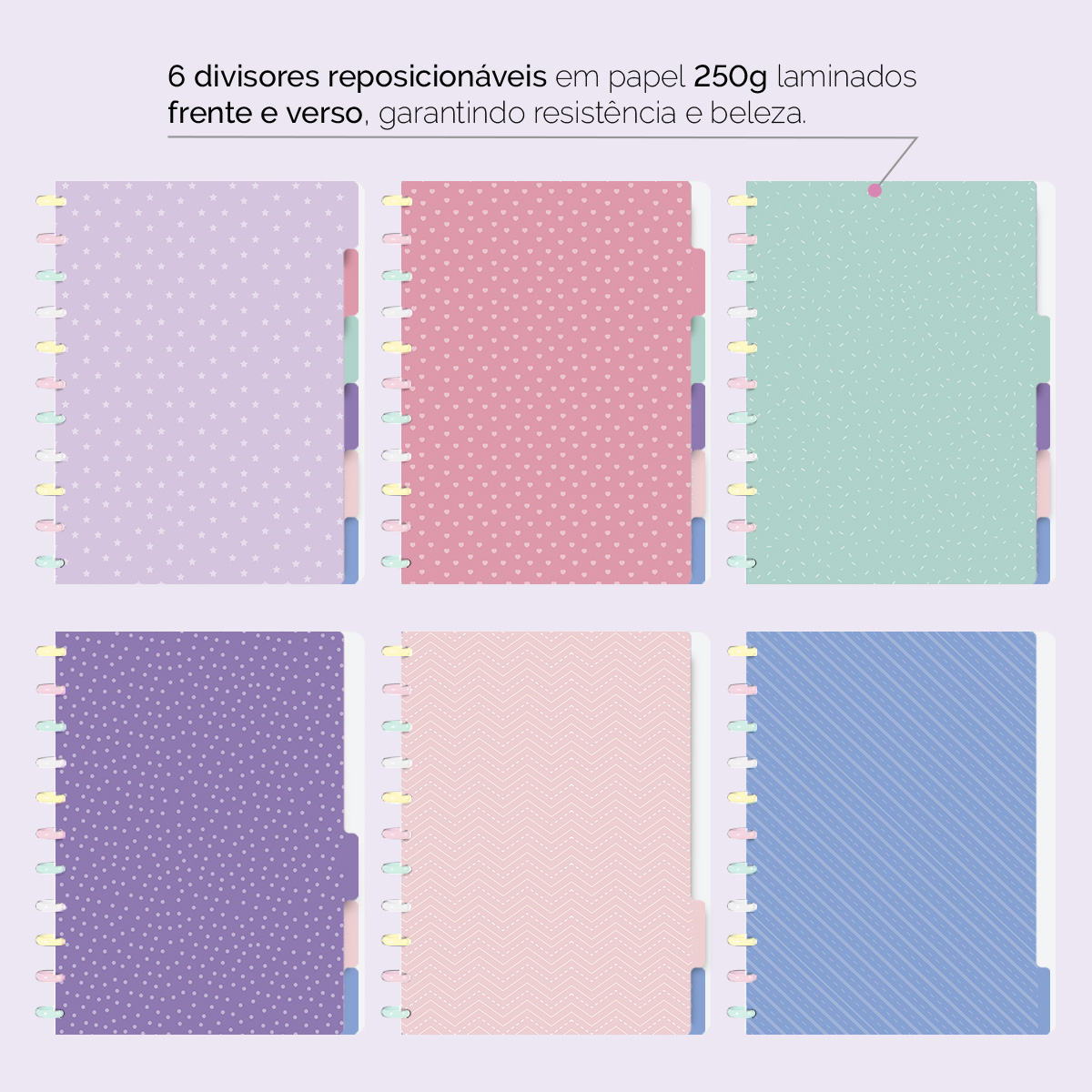 A capa é feita em PP com impressão digital UV de alta definição, acompanha 4 lindas divisórias, que você pode colocar em qualquer local do caderno, funcionando como o guia perfeito para sua organização.